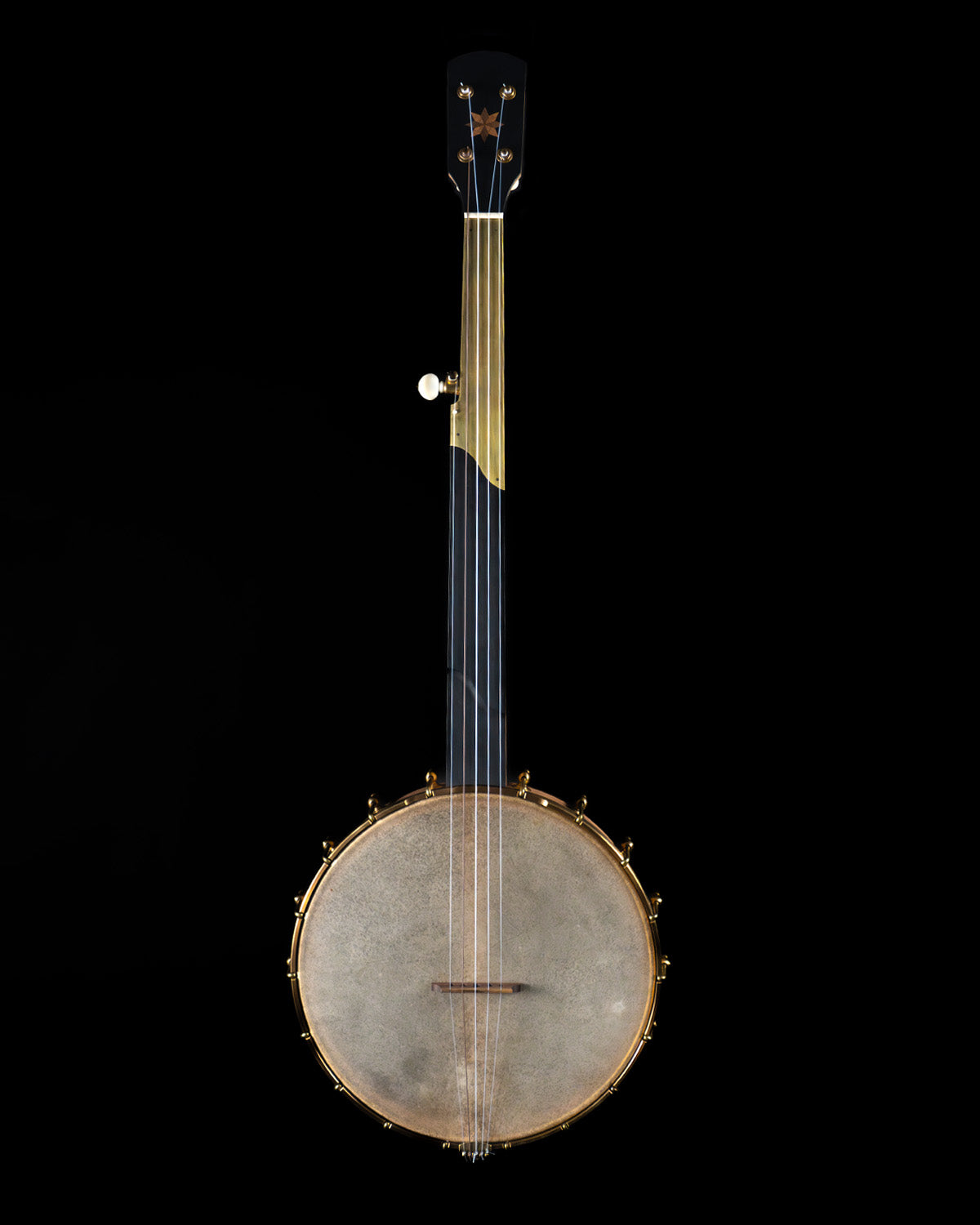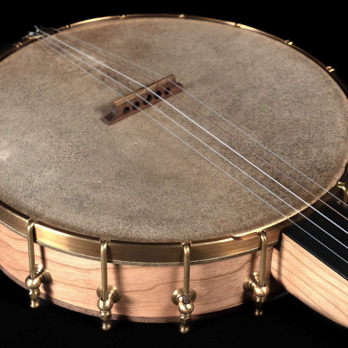 ...can't put fingers on frets that aren't there!! If you need 'em, you won't find 'em here. You can slide to your heart's content on the smooth Richlite fingerboard, and we had them do a partial brass cover plate where the first 6 or 7 would have lived. The rim is cherry, which shares duties with a brass hoop tone ring, nylon strings and a goat skin head in creating this banjo's distinctive, plucky tone. The hardware is a mix of brass and aged brass, and the scale length is 25 3/8". Includes embroidered gig bag.
