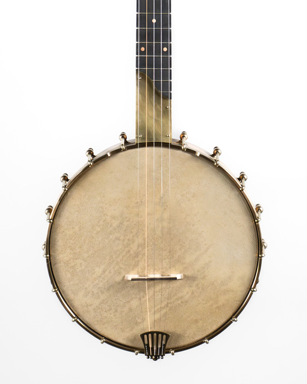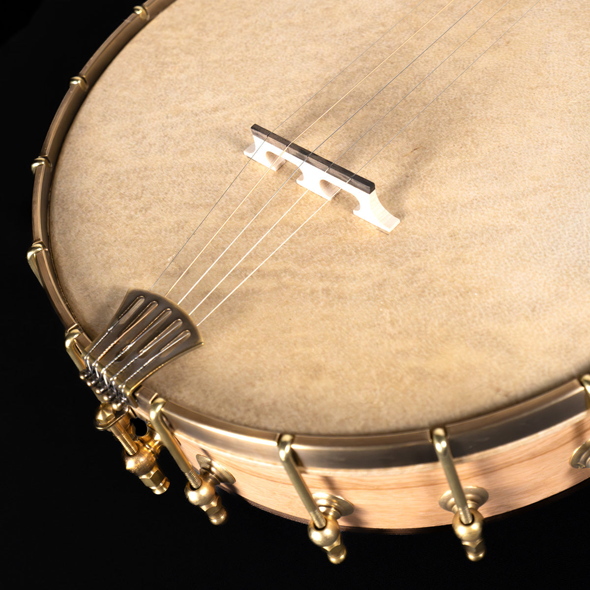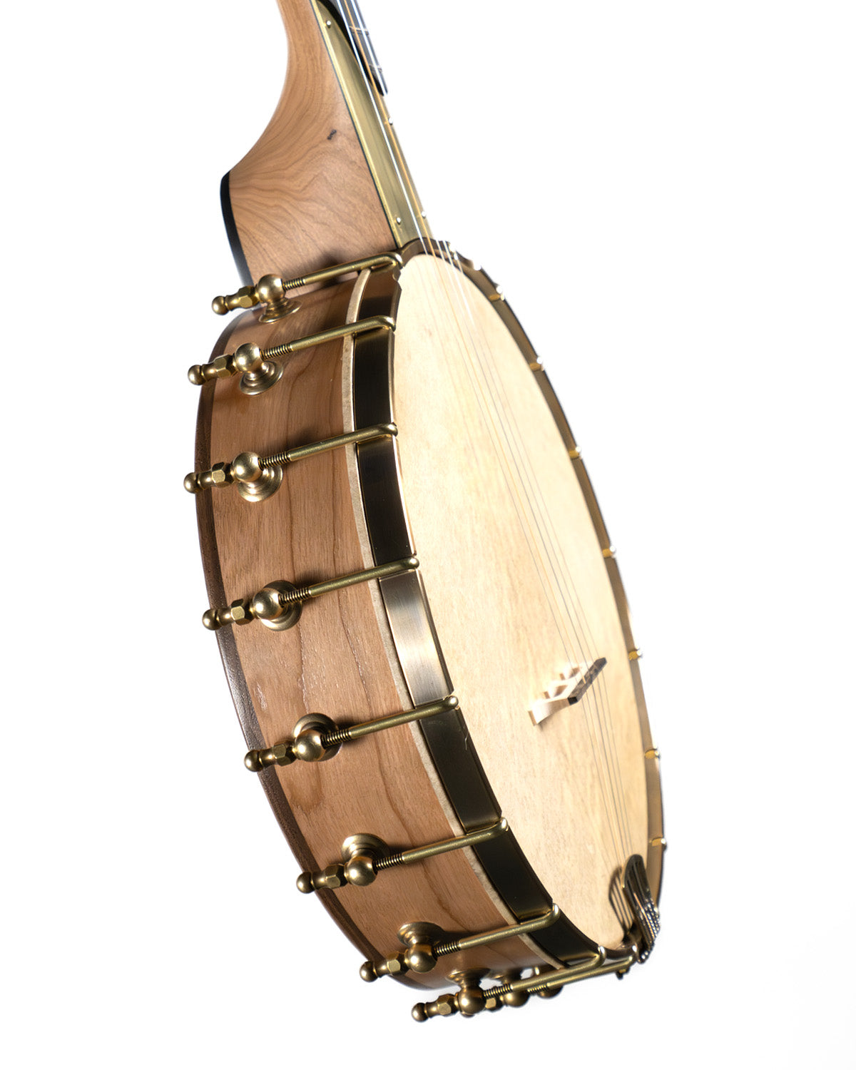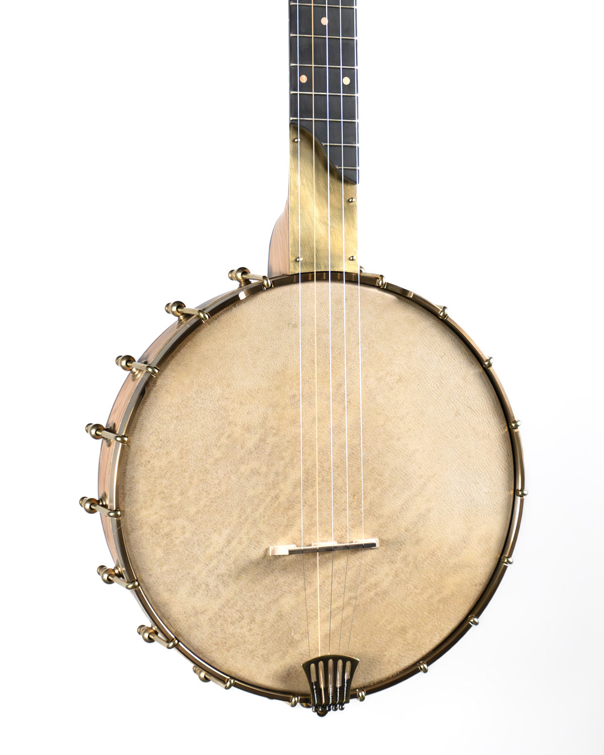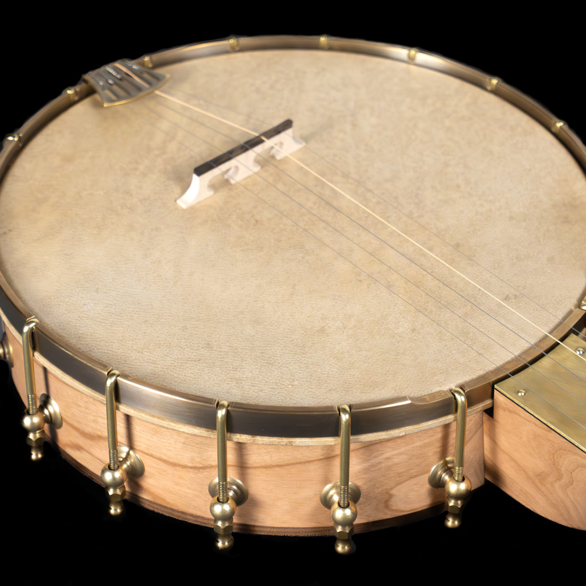 11" cherry rim, hide head (warmer, more plunky tone than modern plastic), aged brass hardware. Fretless plate from nut to 6/7th frets and above the octave, another plate adorning the scoop. 1 1/4" nut width. Hawkeye tailpiece. Aged brass planetary tuners with black buttons. Truss rod access at the peghead via magnetic truss rod cover. Includes embroidered Pisgah gig bag.