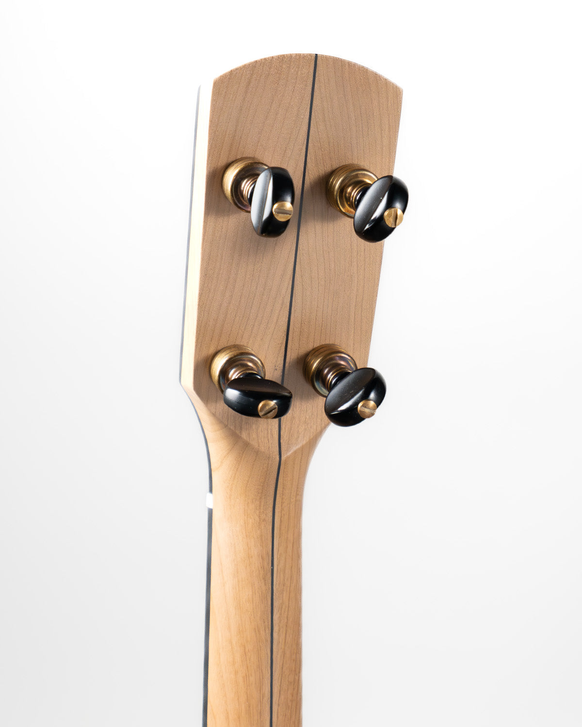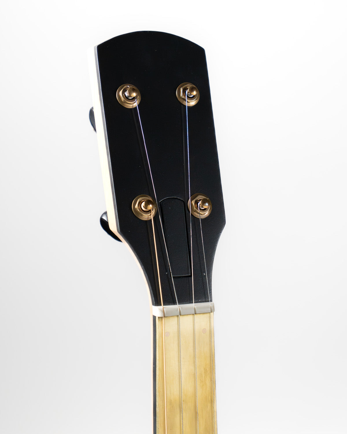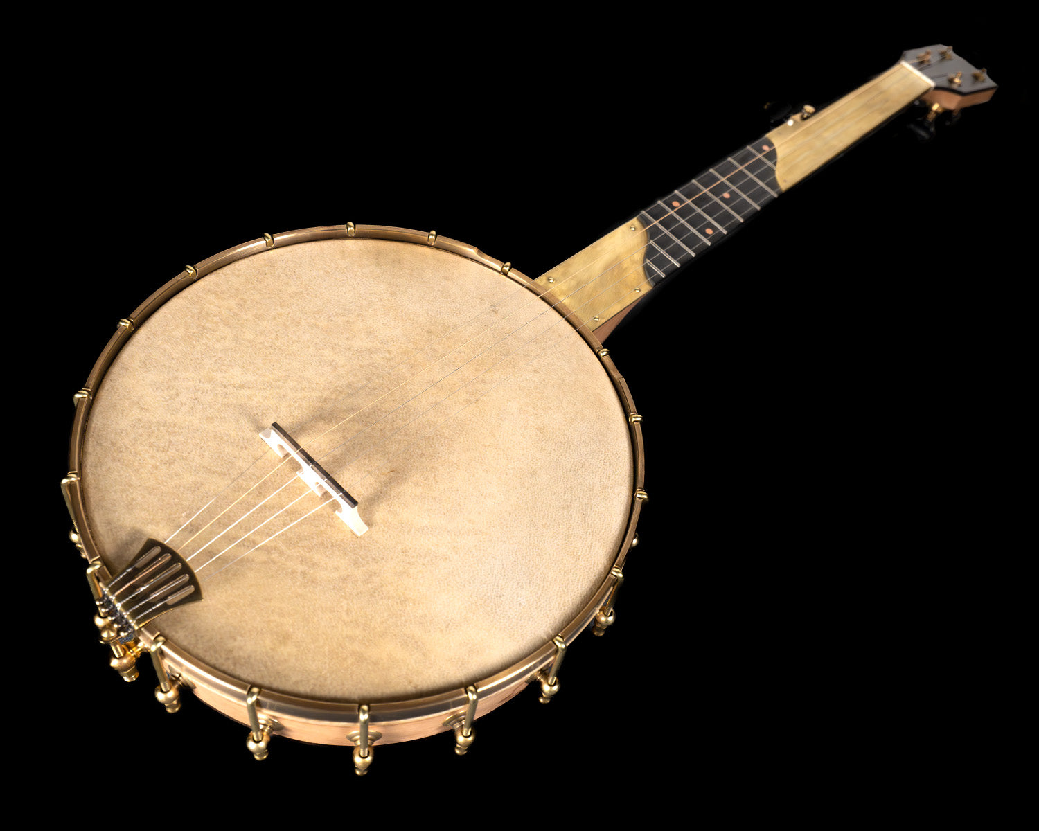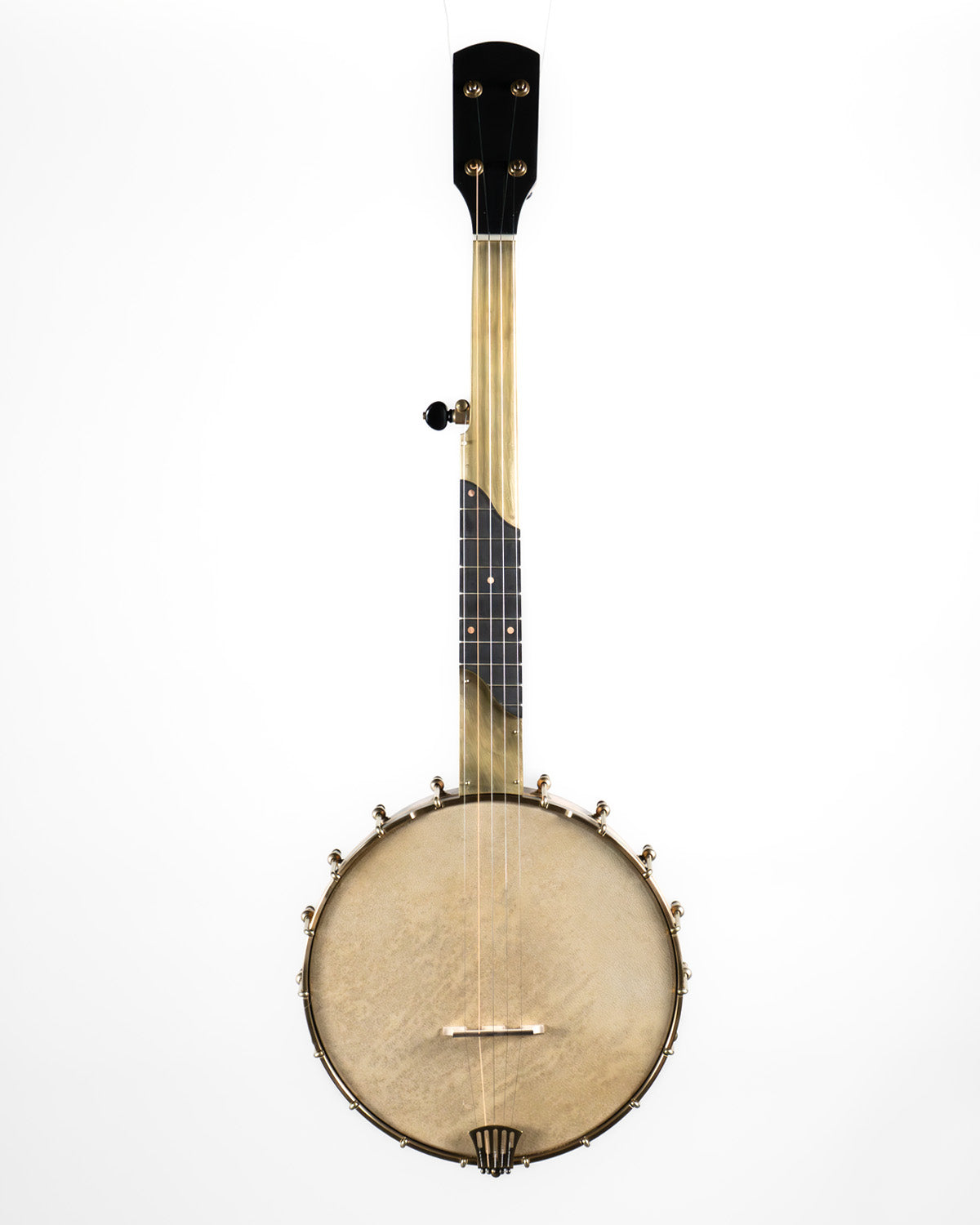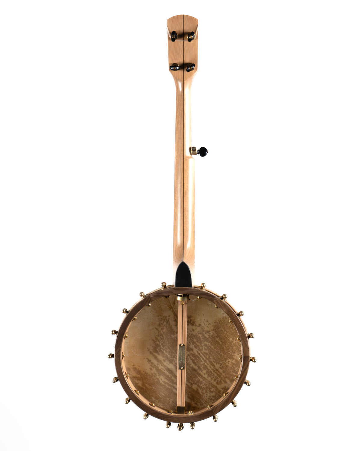 11" cherry rim, hide head (warmer, more plunky tone than modern plastic), aged brass hardware. Fretless plate from nut to 6/7th frets and above the octave, another plate adorning the scoop. 1 1/4" nut width. Hawkeye tailpiece. Aged brass planetary tuners with black buttons. Truss rod access at the peghead via magnetic truss rod cover. Includes embroidered Pisgah gig bag.