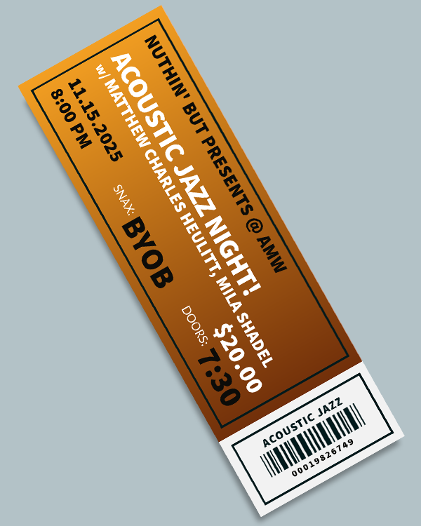 The show - seating is extremely limited! We are offering pre-sale on 50 tickets and then will revert to standing room only on the day of the show. Doors at 7:30pm, music starting around 8pm. $20 guarantees a seat, though not any seat in particular! First come, first pick. This show will be BYOB. Please call us at the shop with any questions!