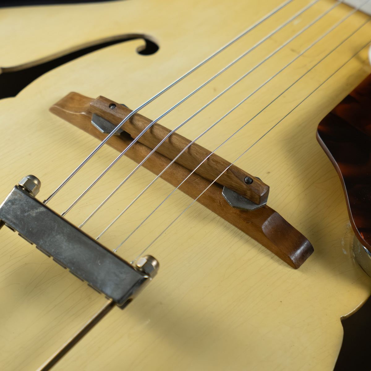 Condition is very good indeed for an 80 year old guitar, action is great, tuners are functioning just fine.  There is a little bit of binding flaking on the treble side upper bout, a fair bit of finish checking on the top.  The floating Regency pickup is wired through the endpin using the Tapastring 1/8" vintage jack, and we're including the cable adapter to used with normal 1/4" cables.  Includes hard case (can't vouch for originality).