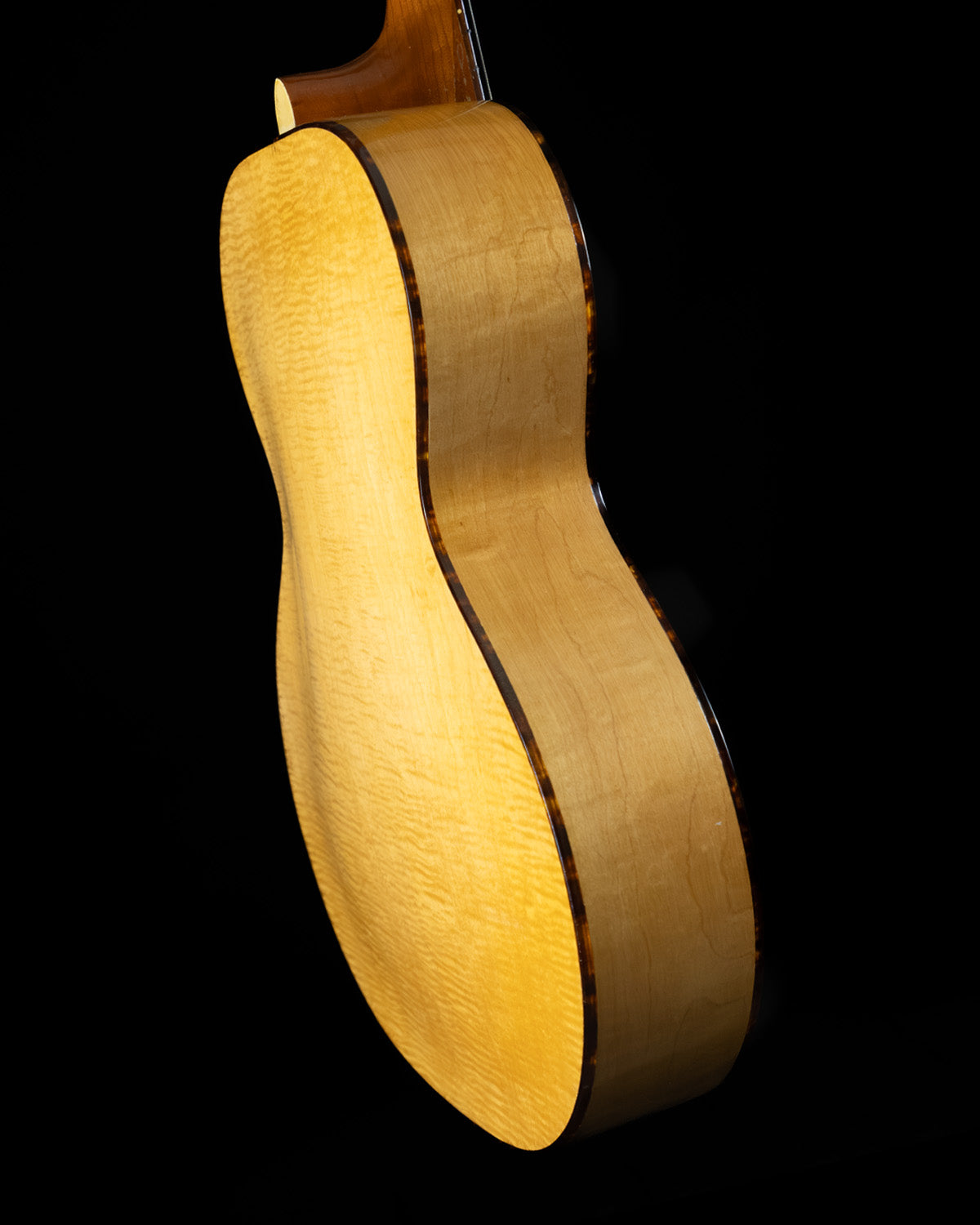 Solid carved spruce top with faded blonde finish, figured maple back/sides, mahogany neck with V profile.  The nut width is 1 5/8" and the string spacing at the saddle is 2" even.  The neck depth measures .943" at the first fret and 1.033" at the ninth.  Long 25.4" scale length.  Brazilian rosewood fingerboard with dot inlays.