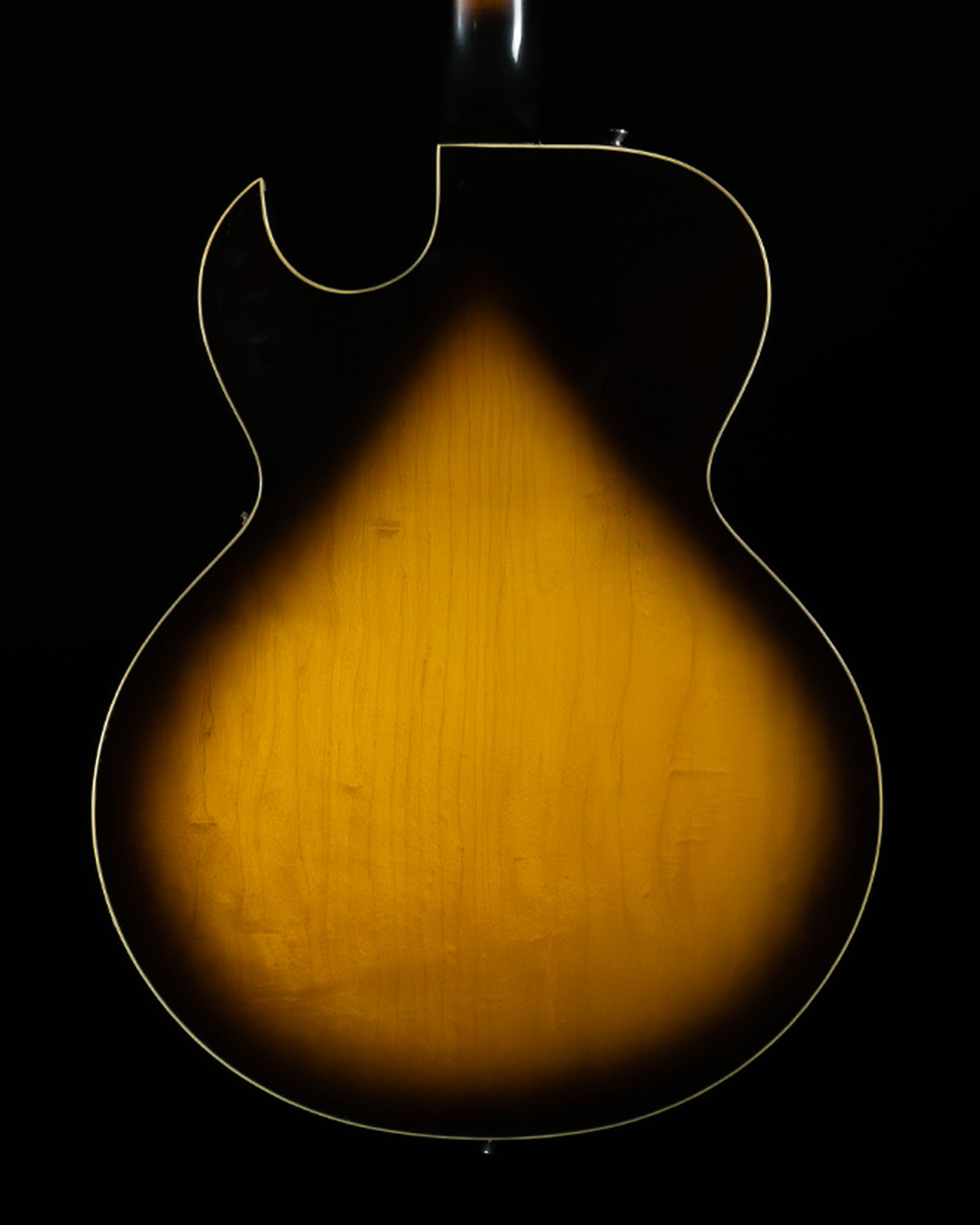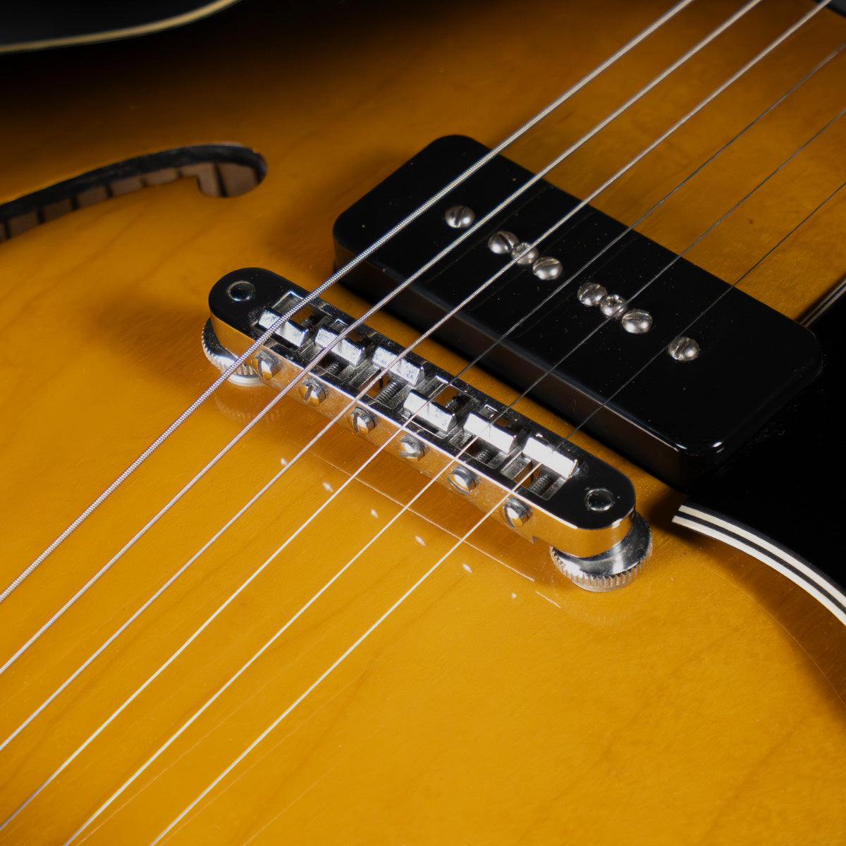 This guitar has been upgraded to Lollar P90 pickups, a big improvement in output and articulation vs the stock pickups. It has a 1 11/16" nut width, Tune-O-Matic bridge with 2 1/16" string spacing, short scale averaging 24 3/4". The neck depth is .844" at the first fret, .963" at the ninth. The fingerboard is rosewood with dot inlays, the tailpiece is trapeze-style, and the tuners have been changed to locking Spertzels.