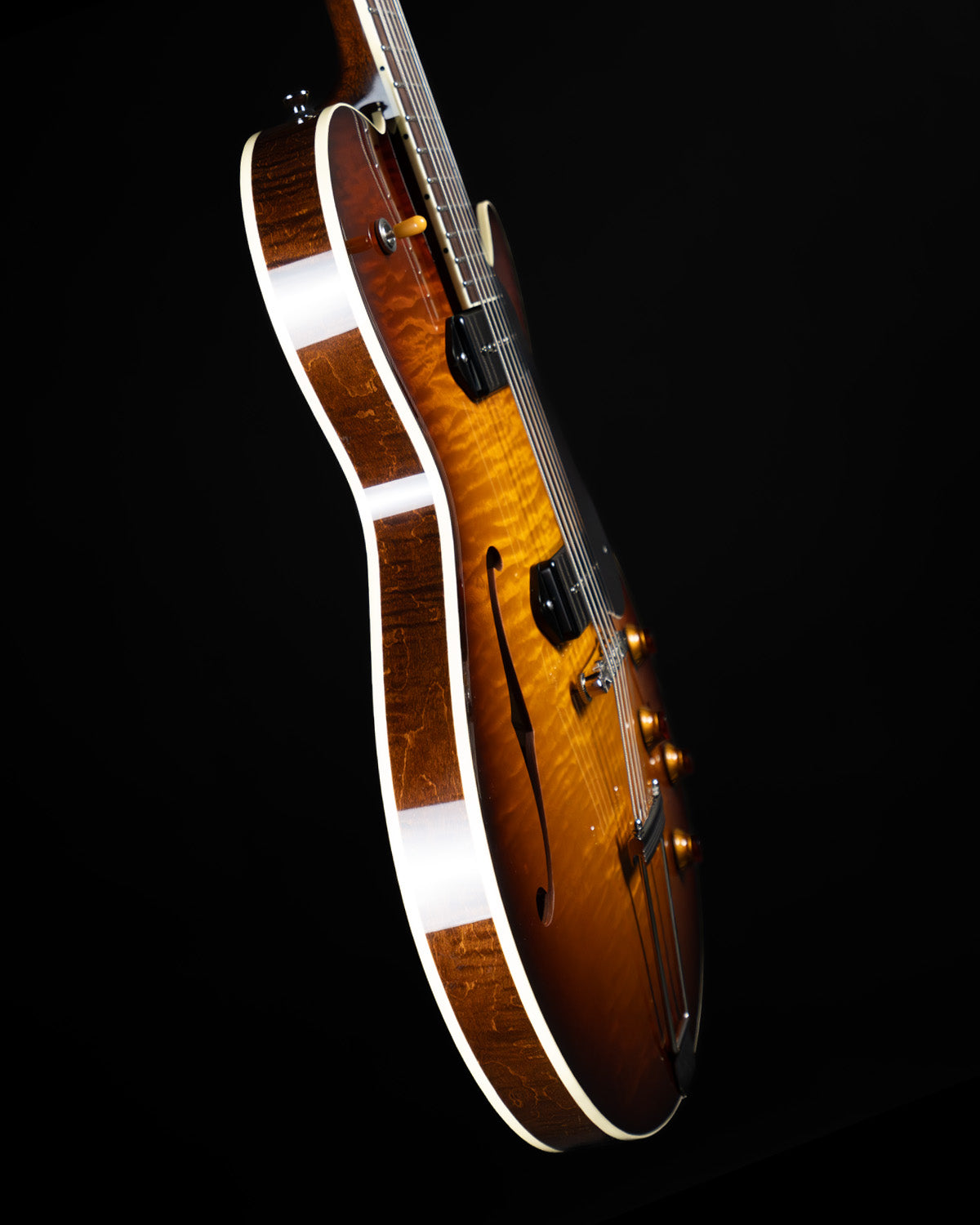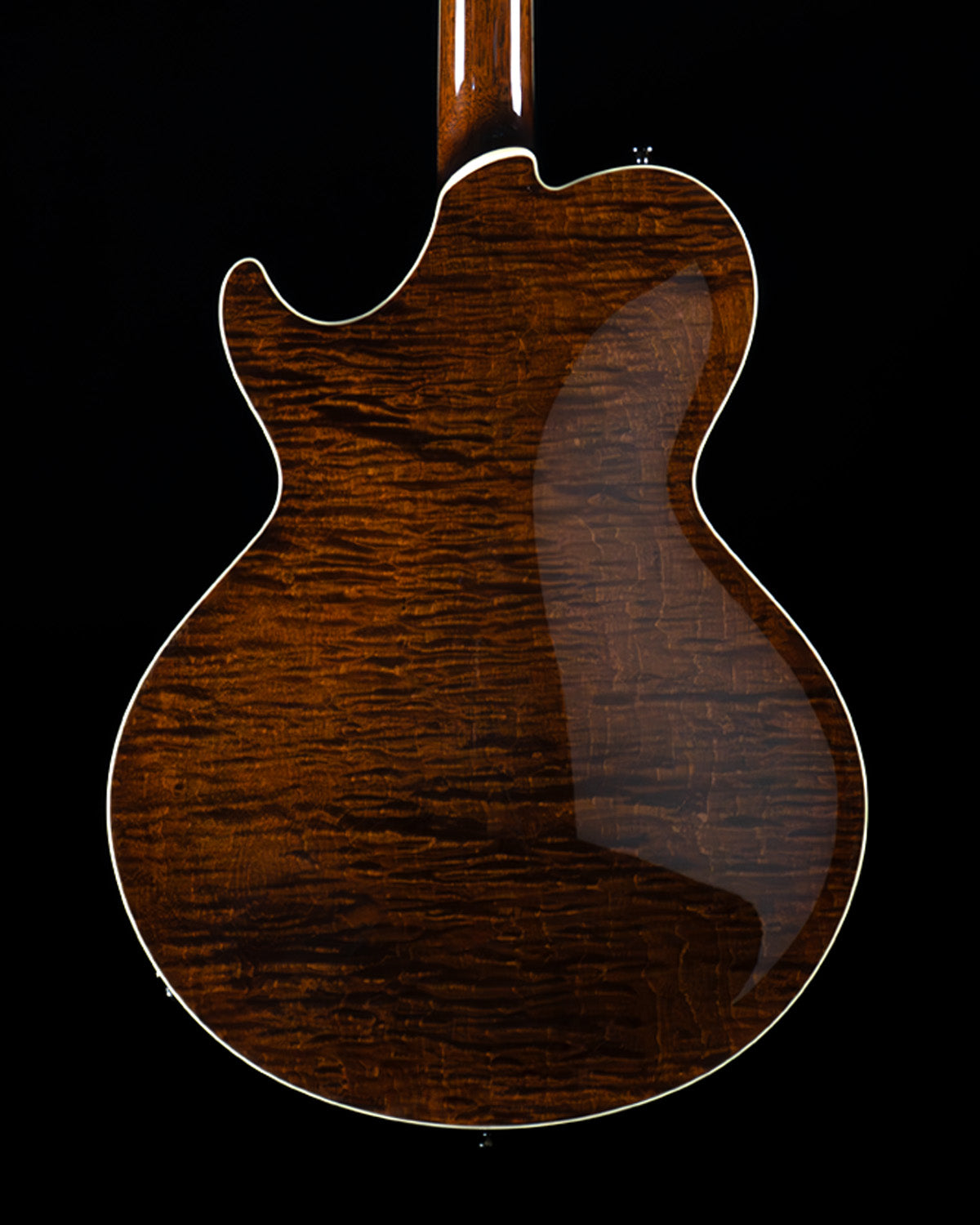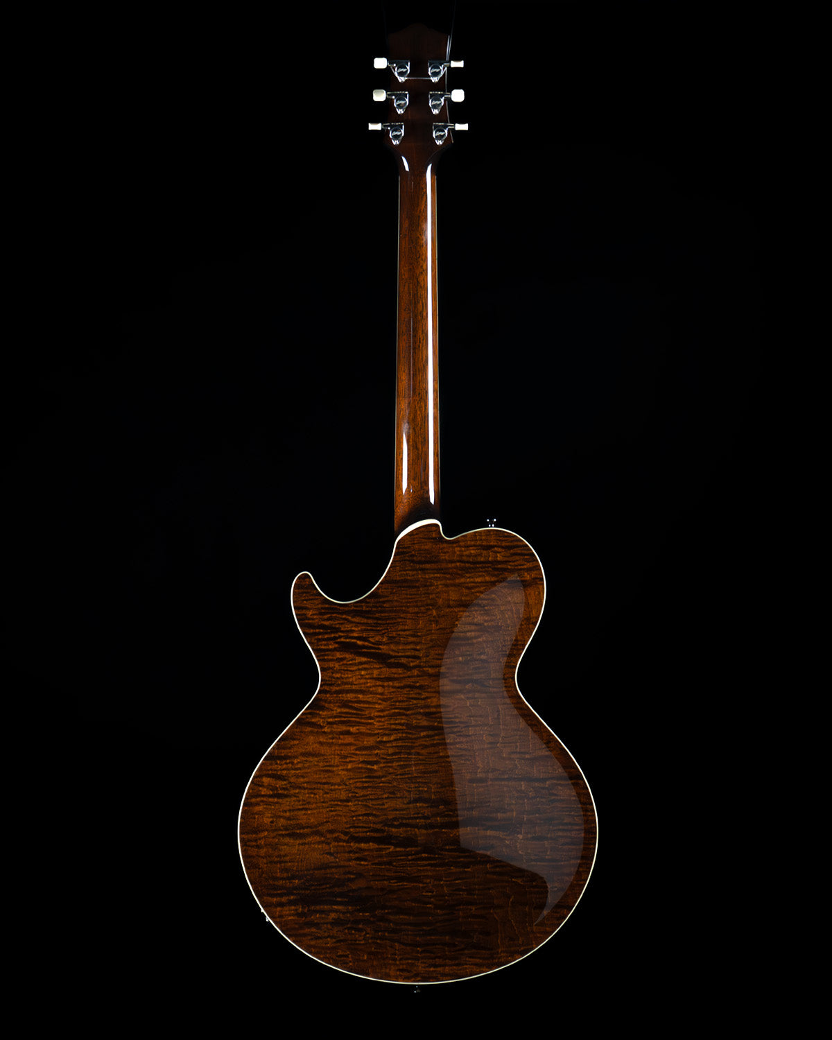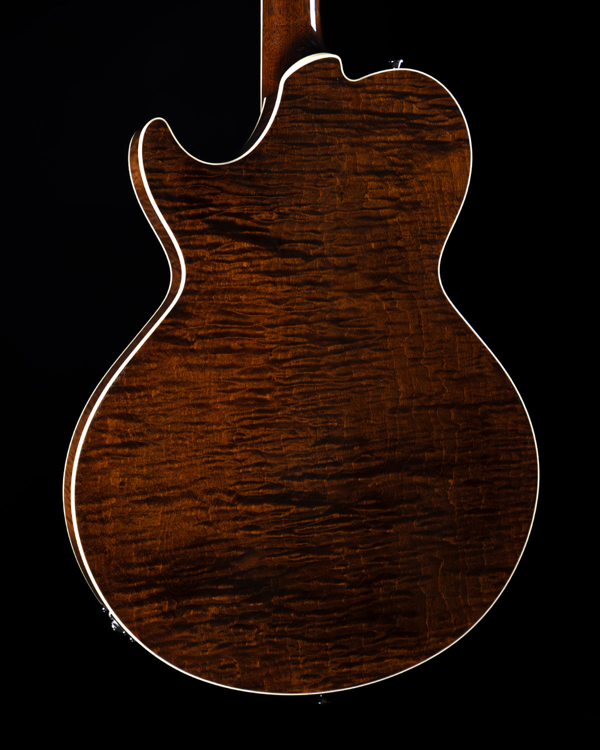 The maple has a deep flame that borders on quilt and looks positively radiant under the tobacco sunburst. Long 27 1/2" scale length with 1 11/16" nut and 2 1/16" string spacing at the saddle. C shape neck measures .873" at the first fret and .992" at the ninth. Rosewood fingerboard with dot inlays.