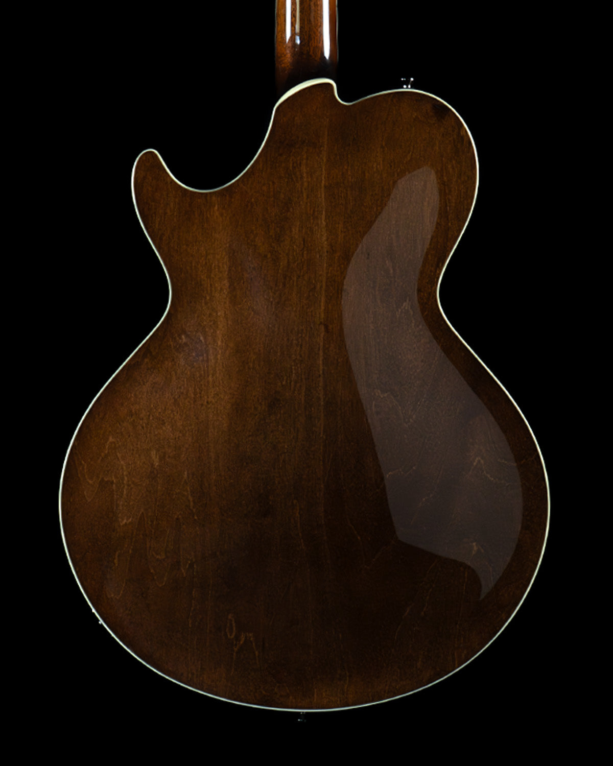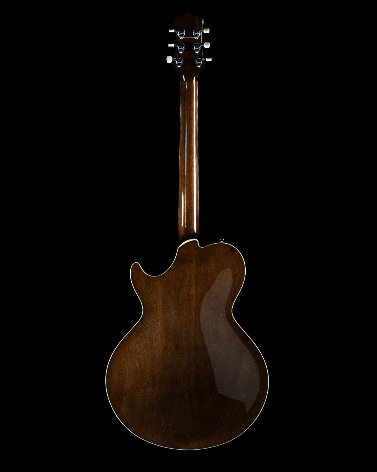 The guitar has "plain" maple with the walnut stain to accentuate the grain. Long 27 1/2" scale length with 1 11/16" nut and 2 1/16" string spacing at the saddle. C shape neck measures .873" at the first fret and .992" at the ninth. Rosewood fingerboard with dot inlays.