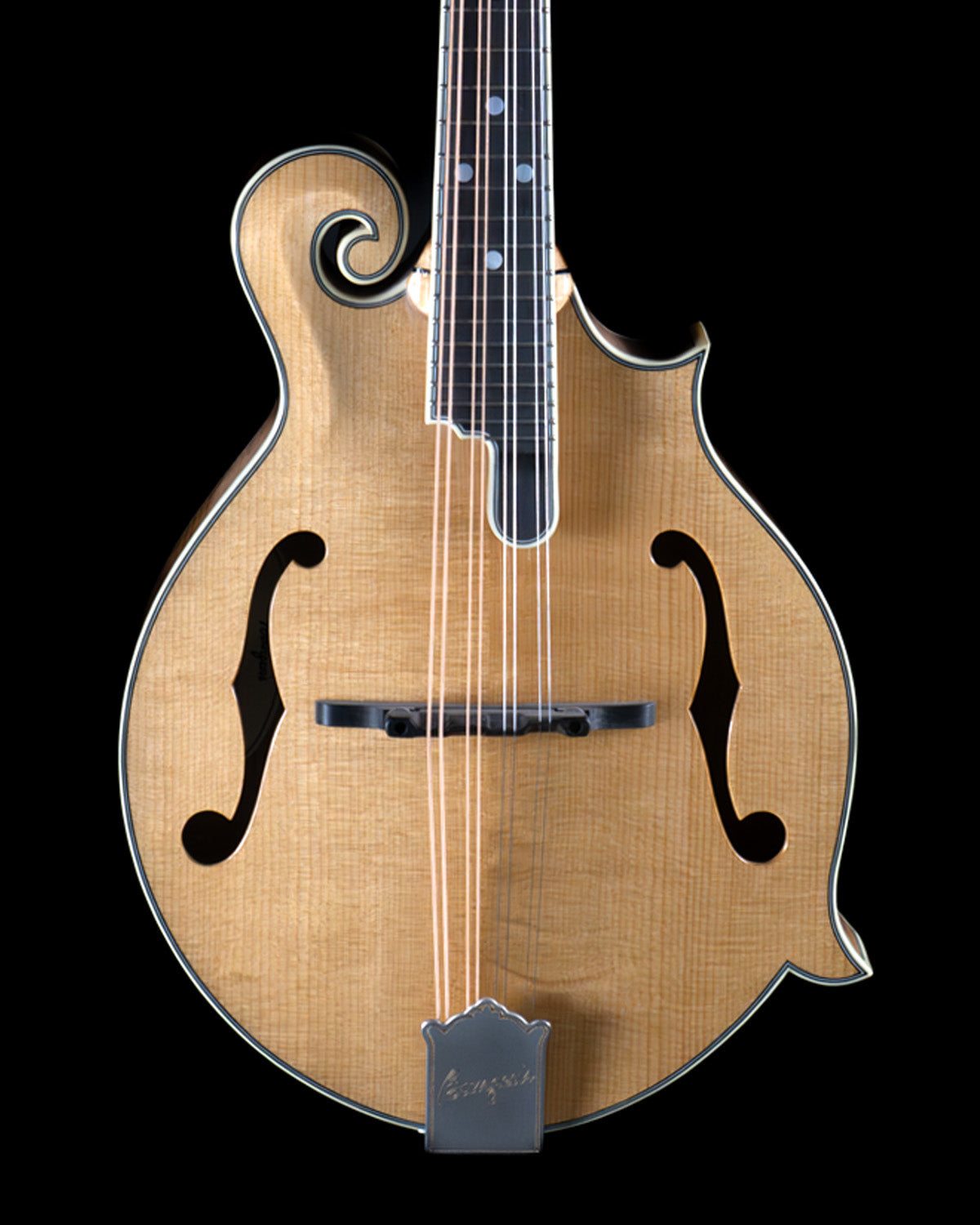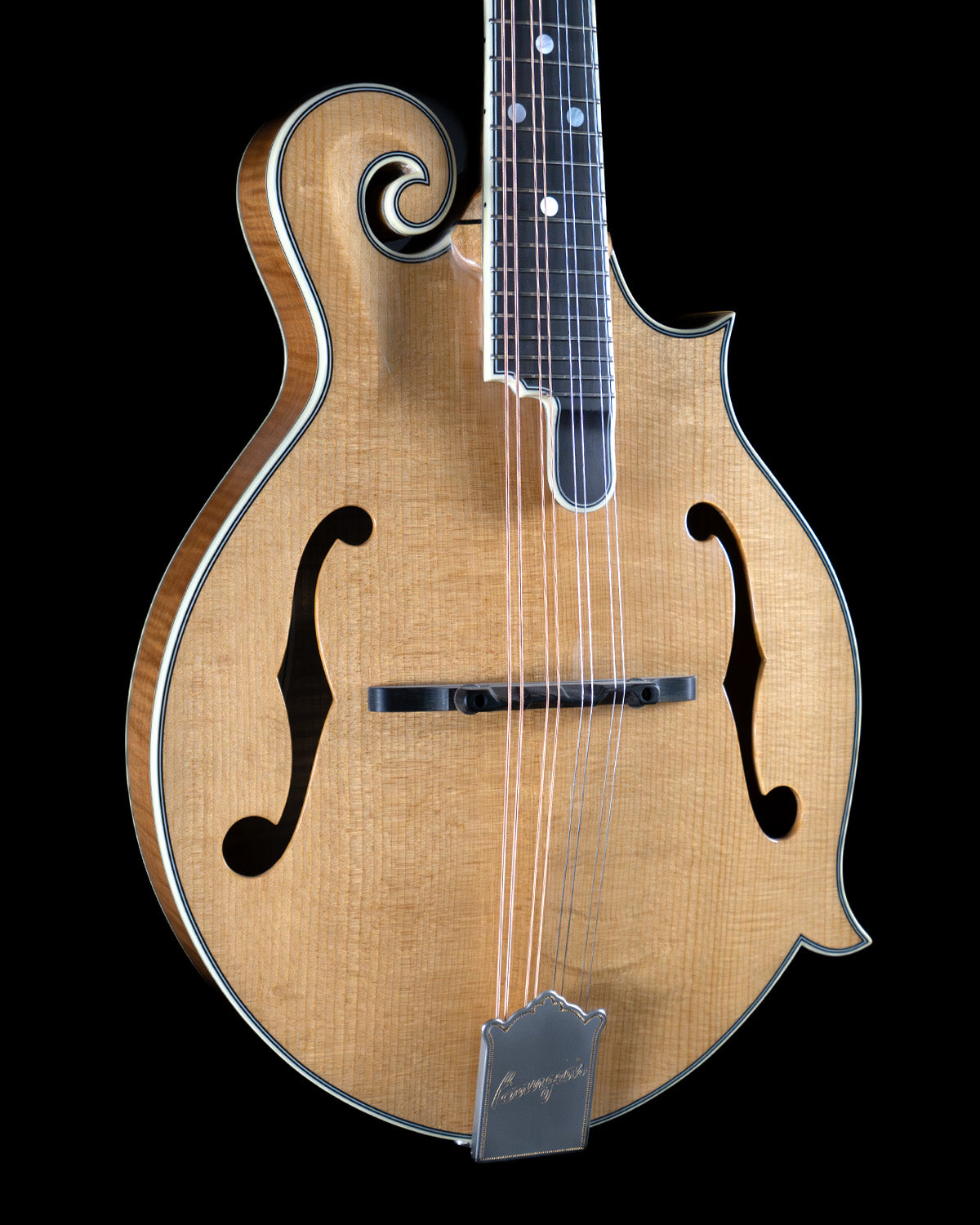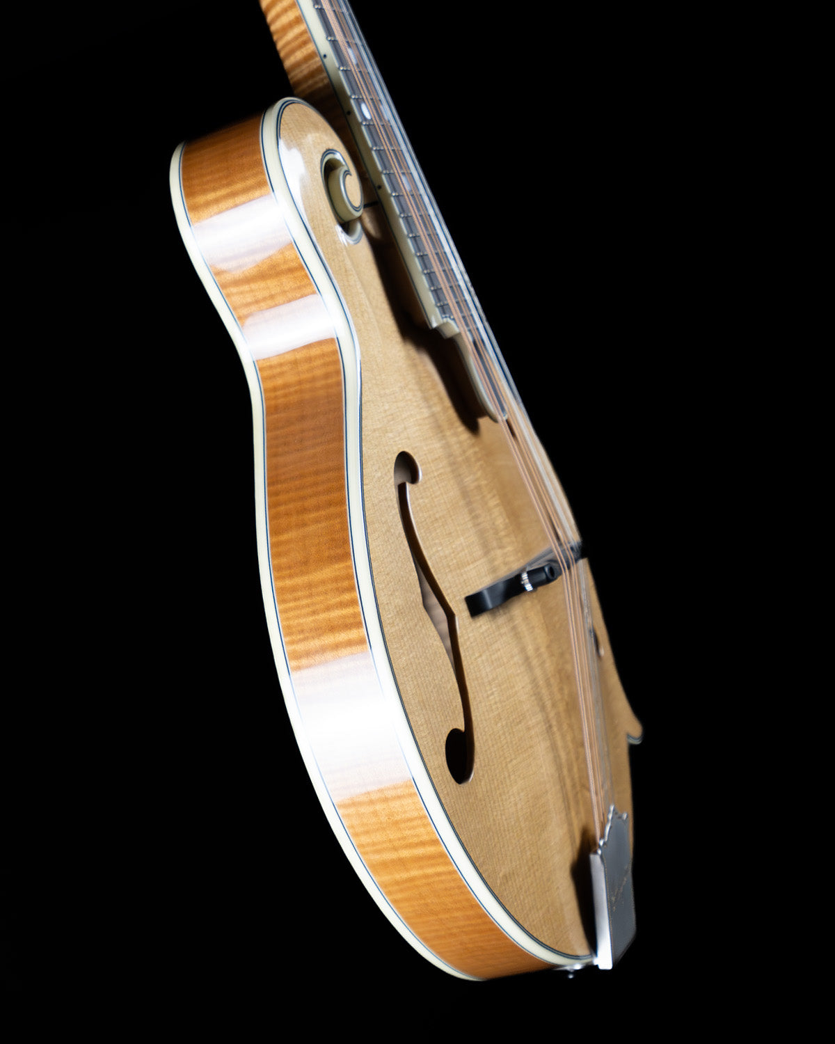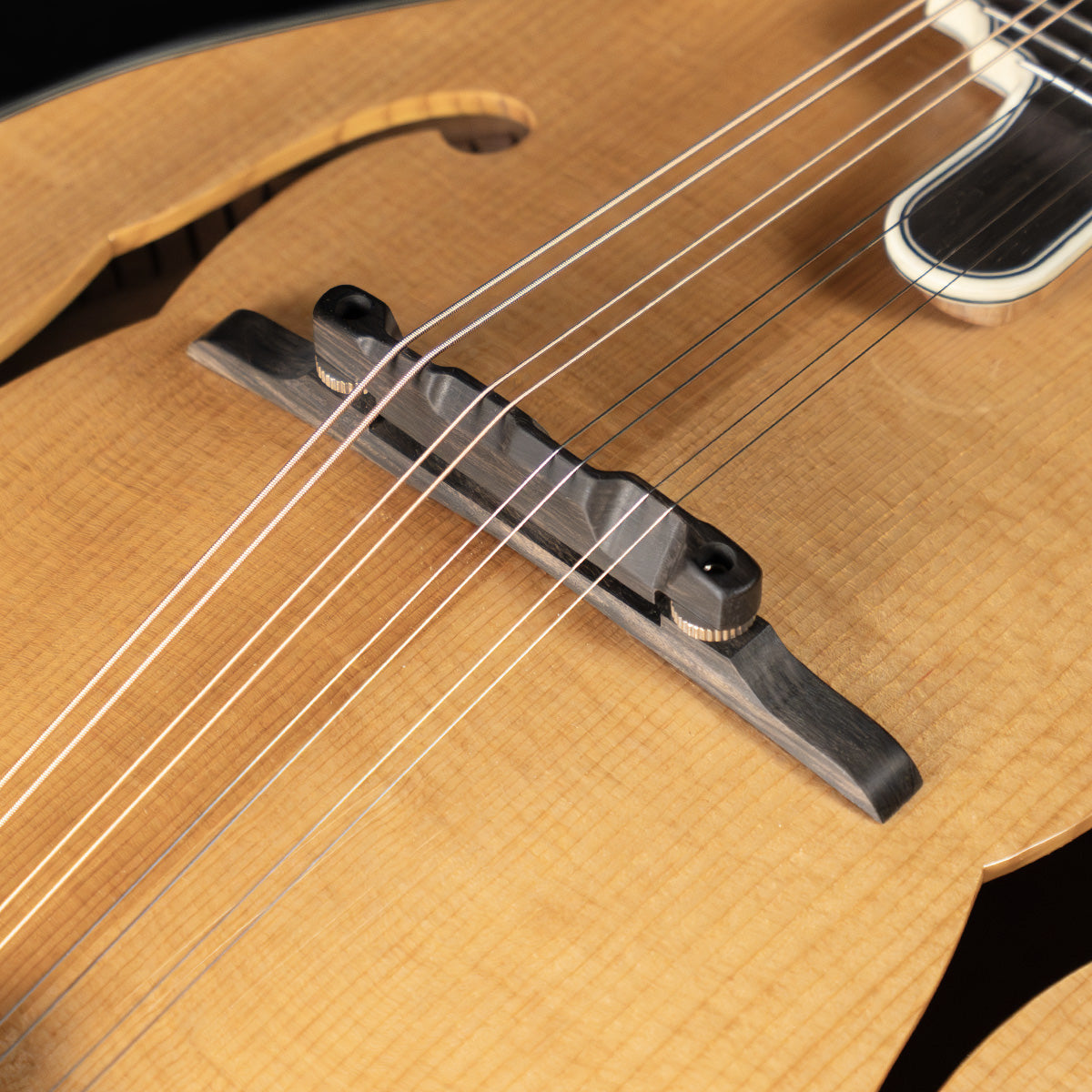 Guitarists who double on mandolin will appreciate the "wider" 1 and 5/32" nut width (usually standard on oval-hole instruments) and the appointments are classic, through and through: ebony fingerboard, ivoroid peghead, neck and body binding, high gloss finish, Waverly Golden Age tuners and an engraved James tailpiece (the BEST for changing strings with ease!)