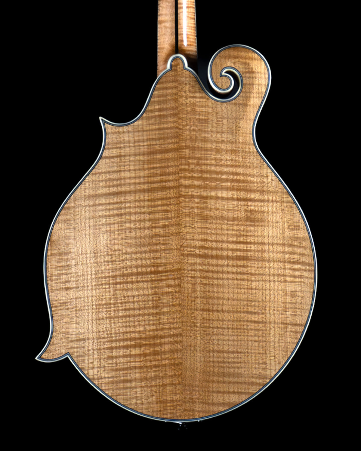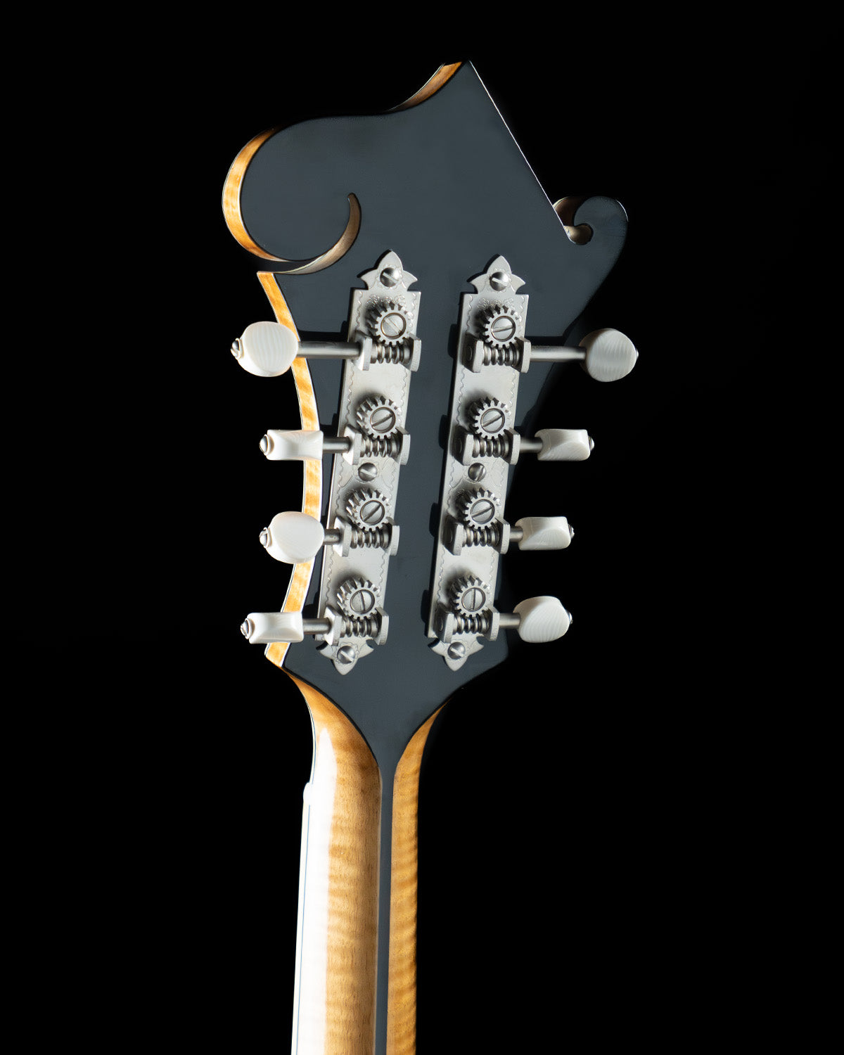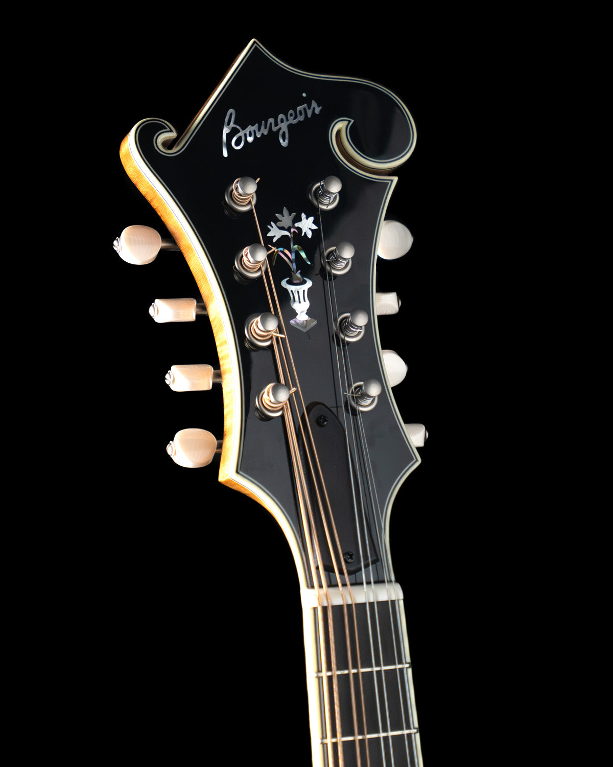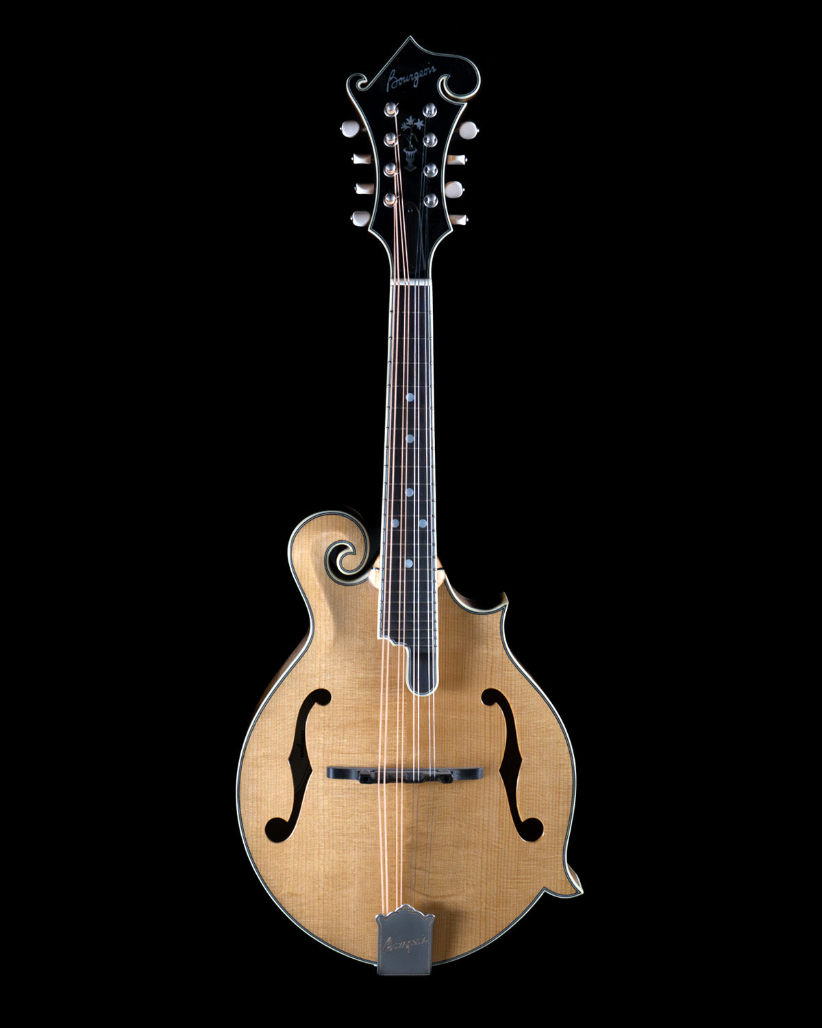Guitarists who double on mandolin will appreciate the "wider" 1 and 5/32" nut width (usually standard on oval-hole instruments) and the appointments are classic, through and through: ebony fingerboard, ivoroid peghead, neck and body binding, high gloss finish, Waverly Golden Age tuners and an engraved James tailpiece (the BEST for changing strings with ease!)