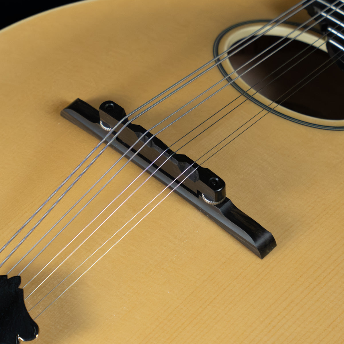 Engelmann spruce top, maple back, sides and neck. 1 3/16" nut width, standard on Collings' oval hole instruments. Compound radius ebony fingerboard, ebony bridge, Collings tail piece. Nickel tuners with ivoroid buttons.