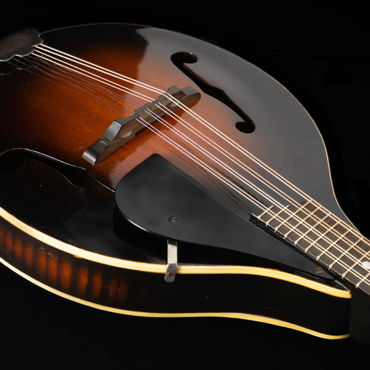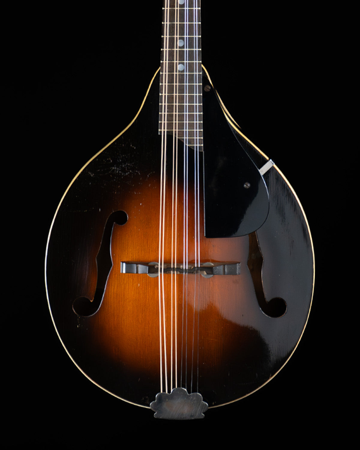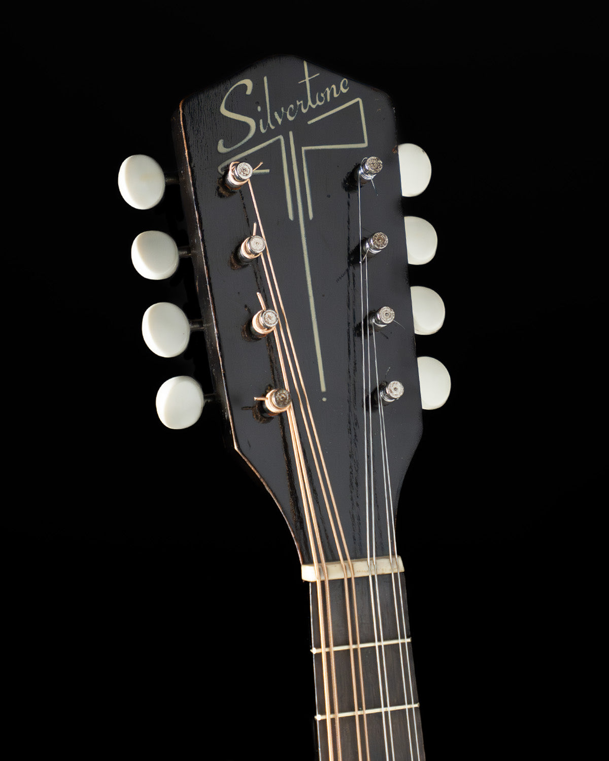 (USED) Here is a cool, funky little A model branded Silvertone, we believe it to be from the 1960s. It has a solid spruce top and laminated pressed maple back/sides. It has a traditional sunburst with a lacquer finish that has some checking and some scratches and pick marks, but still retains a vivid color. The nut width measures just a whisker above 1 1/8" wide and the frets and fingerboard are in very good shape. Tuners appear to be the originals and are functioning well.