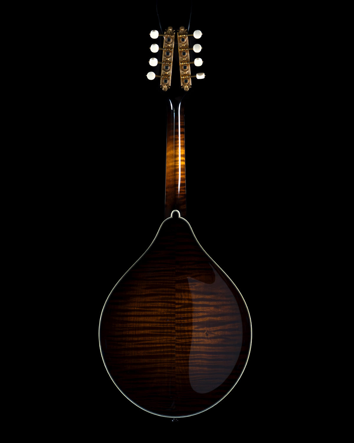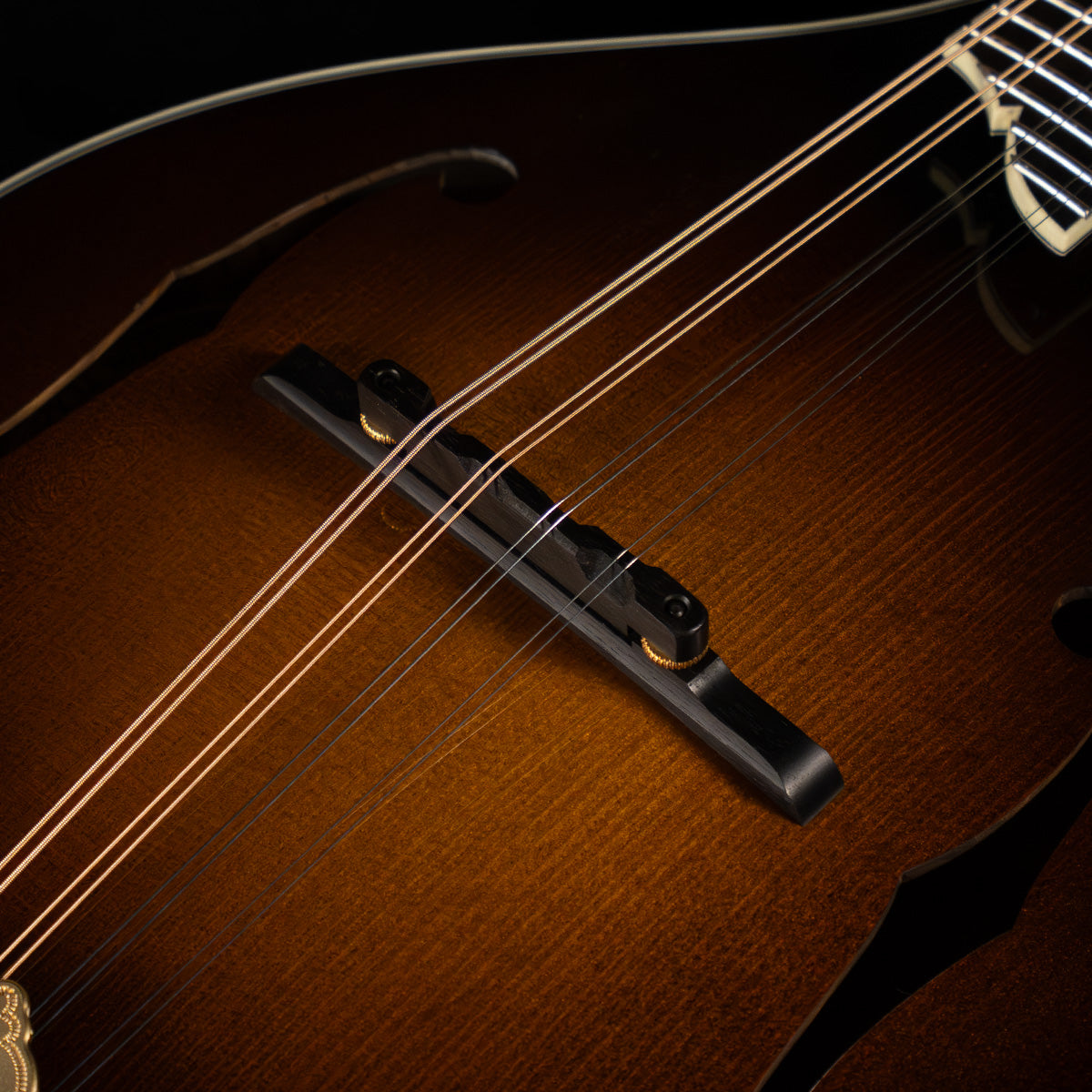 Standard specs include 1 1/8" nut, bound body, neck and peghead. Compound radius ebony fingerboard with pearl dot inlays. Pearl flourish on the peghead. The tailpiece has been upgraded to James, gold to match the tuners (ivoroid buttons on those, to match the aforementioned bindings). Includes hard case.