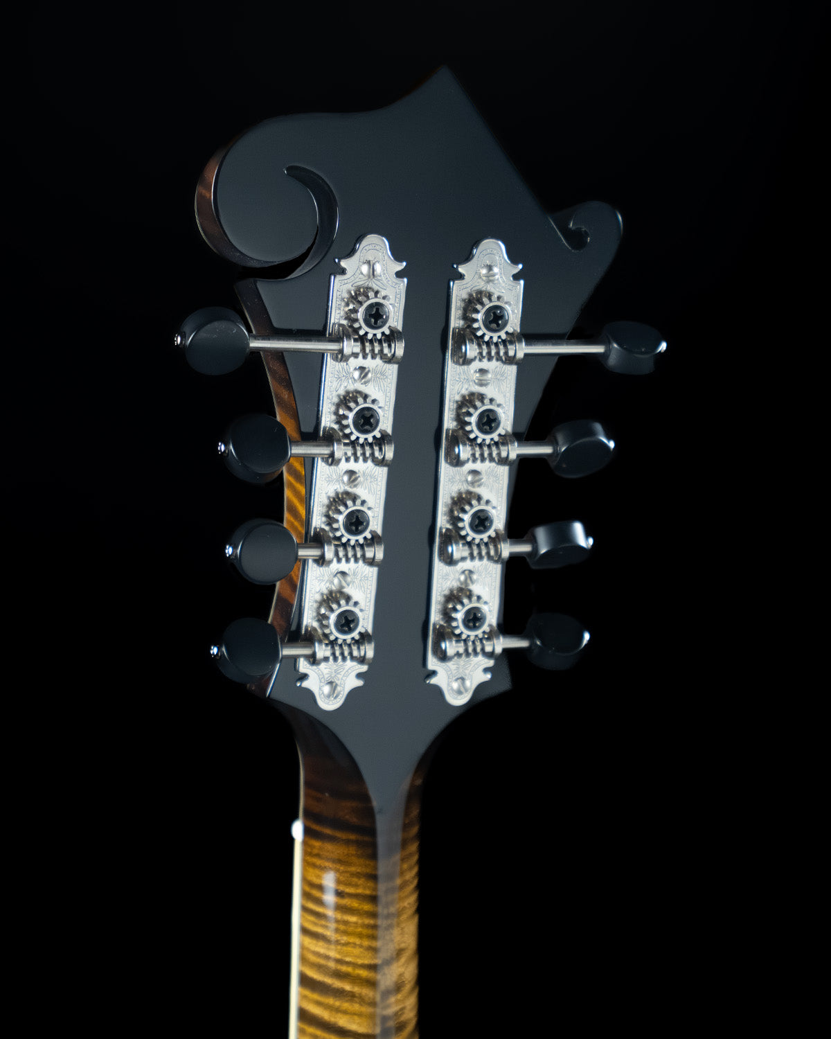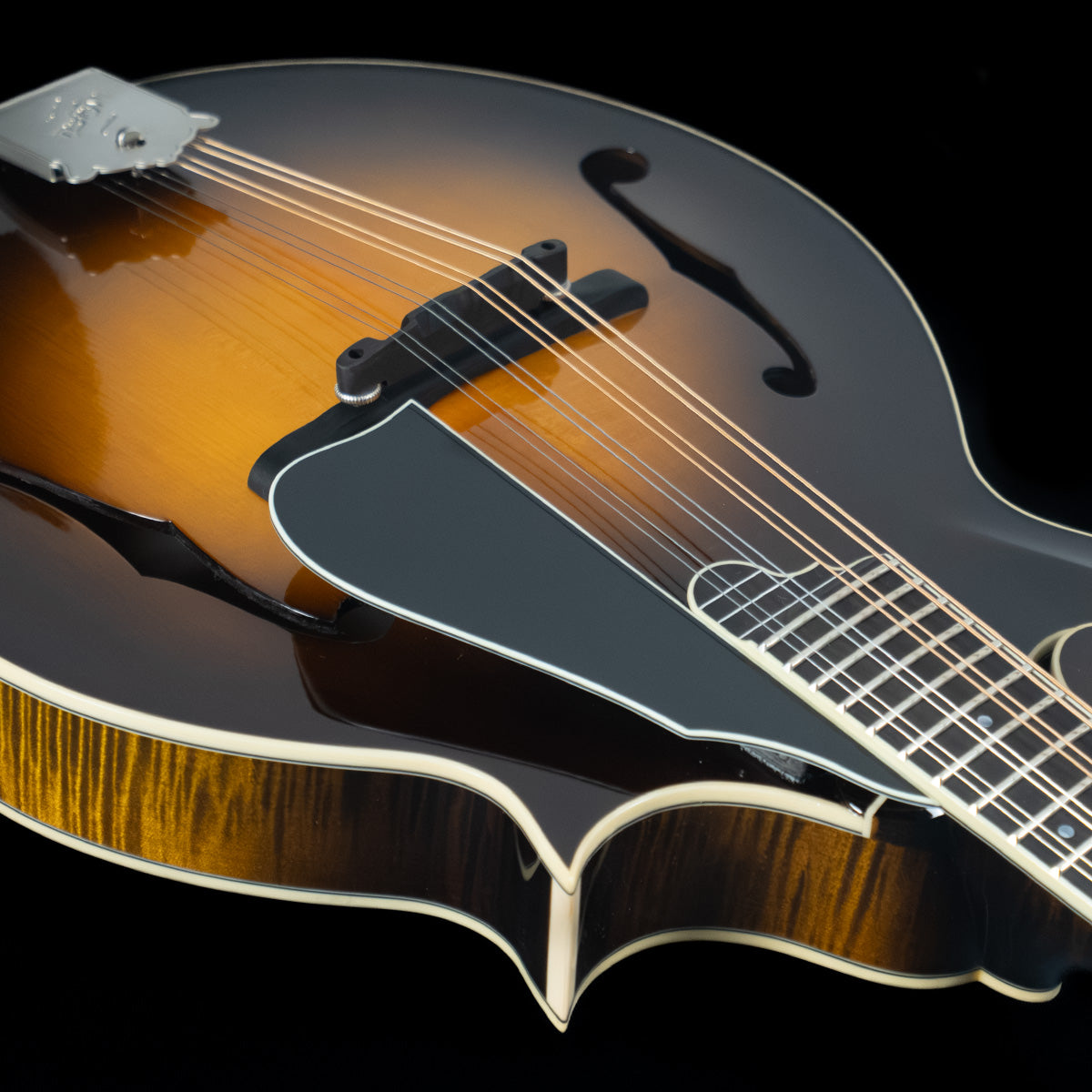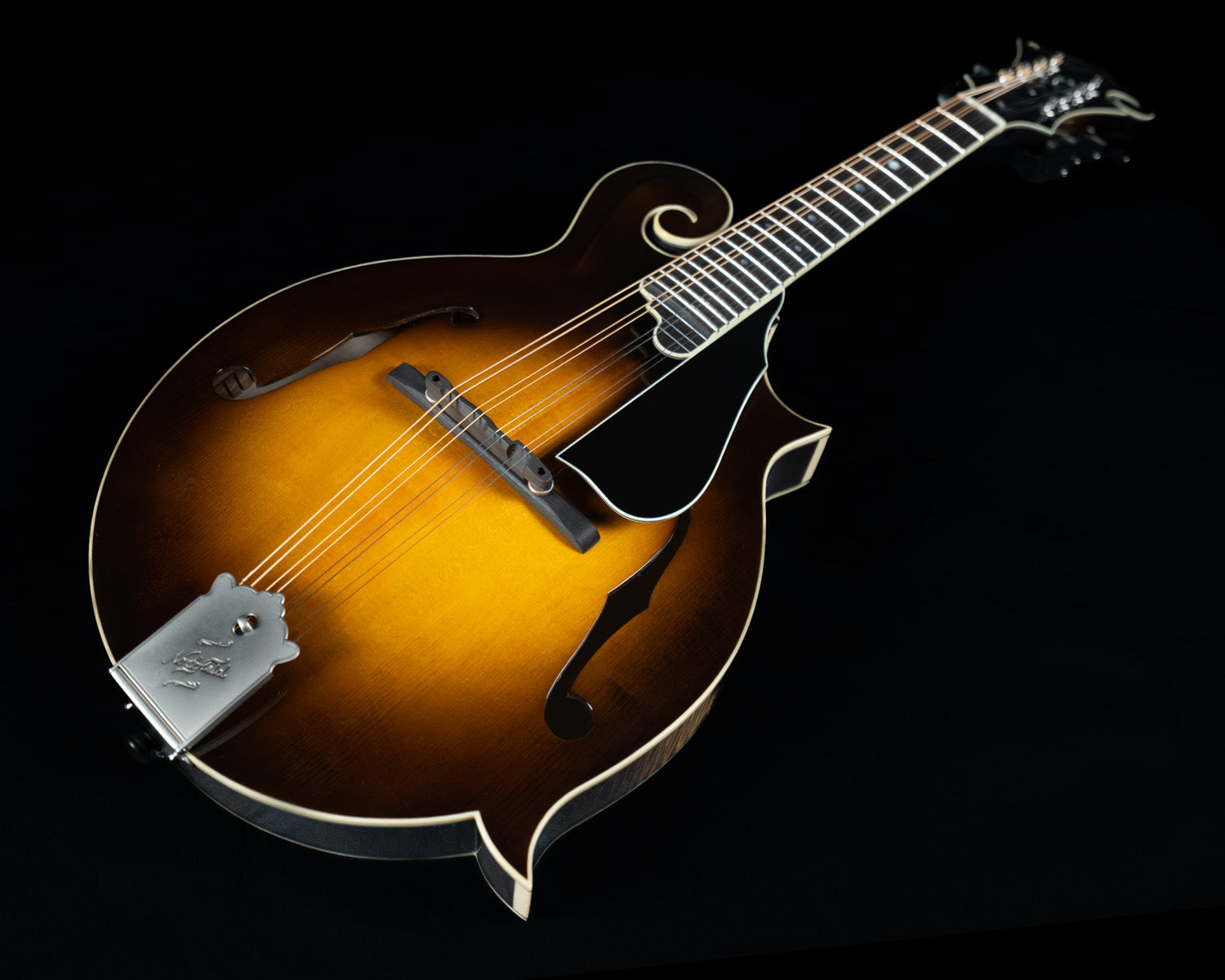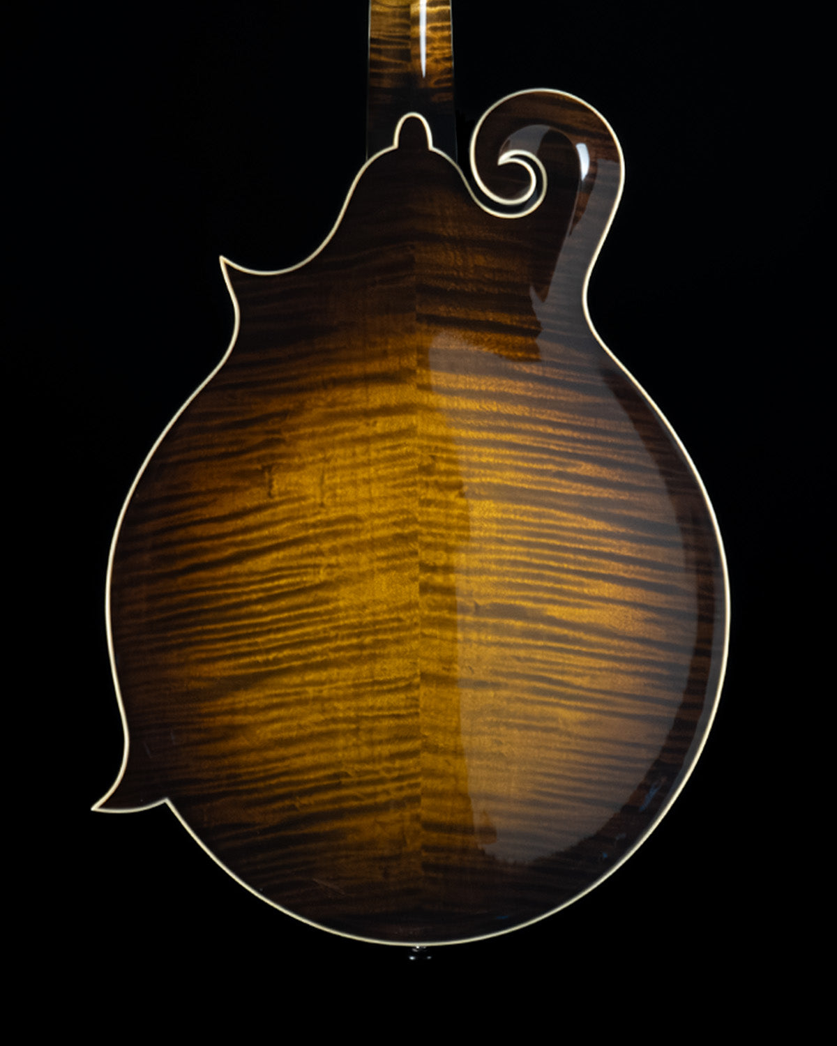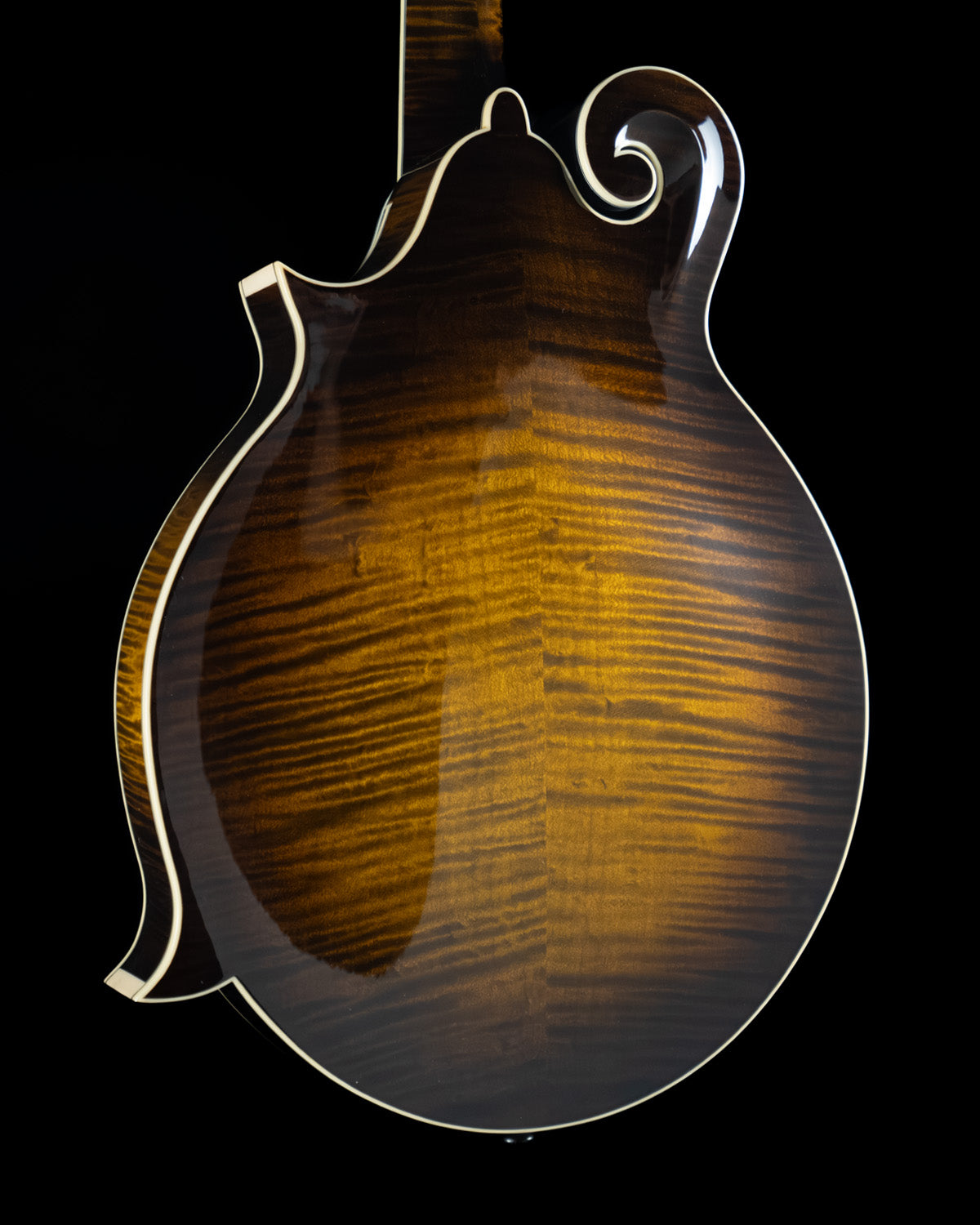 Adirondack spruce top, flamed maple back w/ maple sides.  The Big Mon, as you probably know, is slightly larger than a typical F model, and resonates at a slightly lower frequency.  It is renowned/beloved for its gutsy sound.  We spec'd this one with the wider 1 3/16" nut.