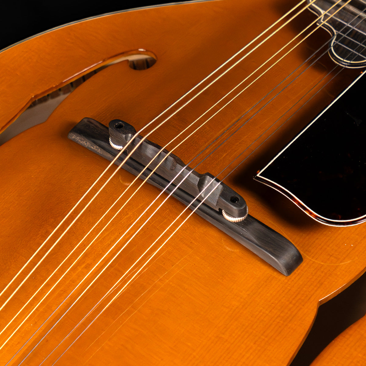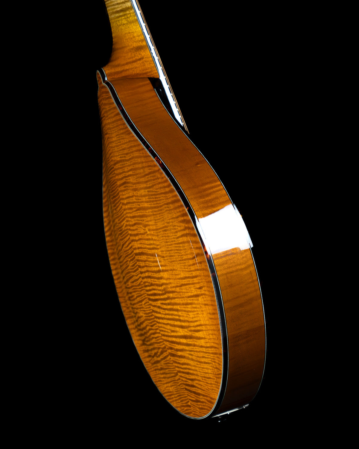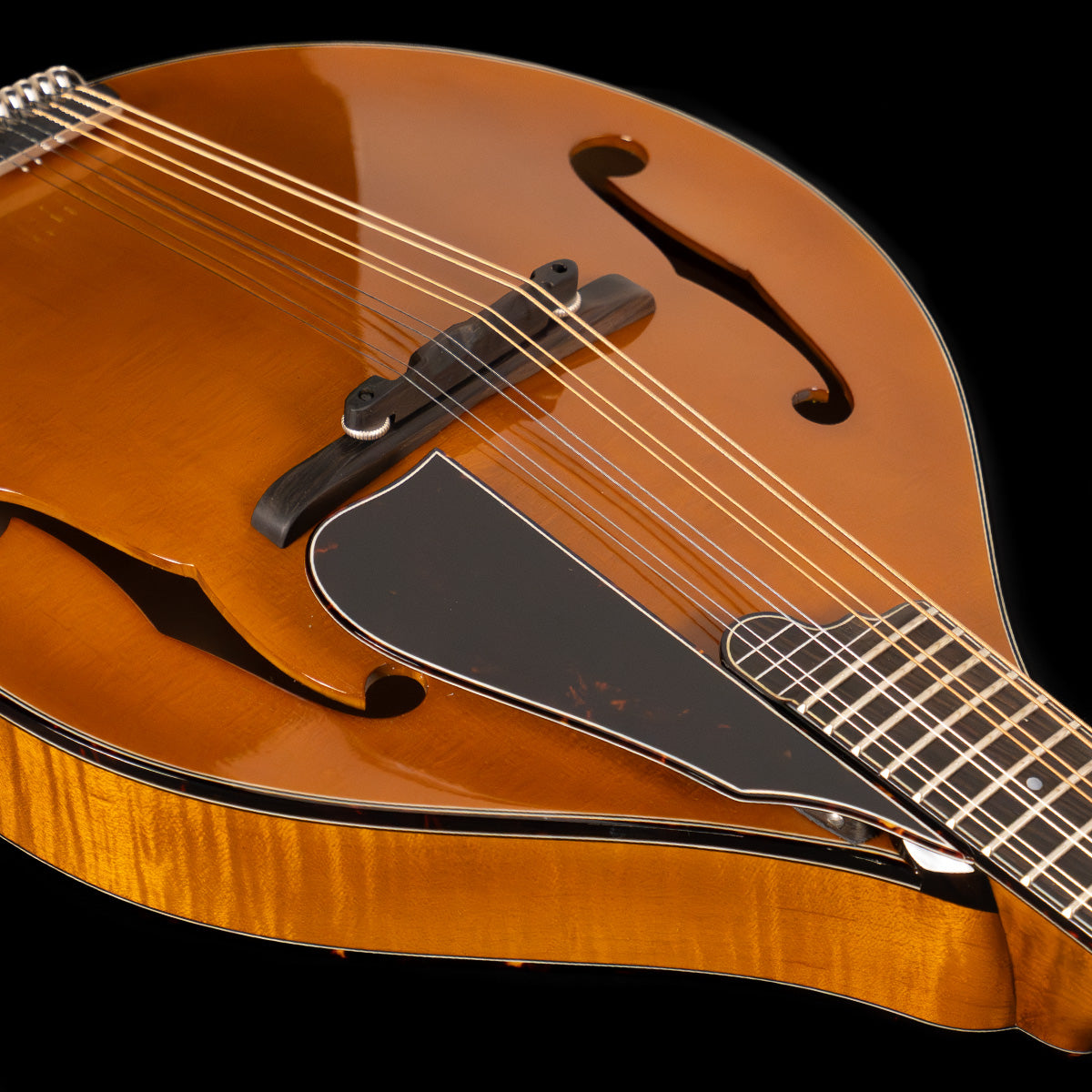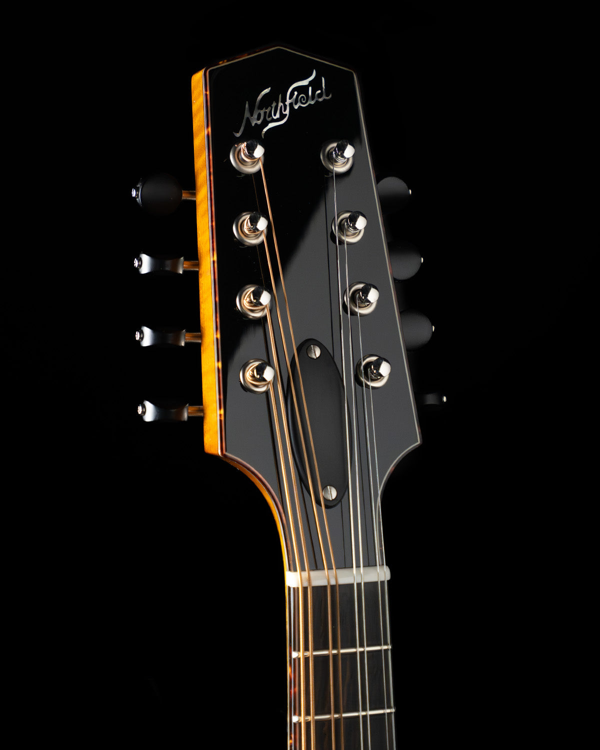 (NEW) We all know not to stare directly at the sun, but there's no harm in gazing into the shiny goodness on display with this Northfield A5 Special! The Italian Alpine spruce on this mandolin has some of the tightest, most uniform grain we've seen in some time. The figured maple really pops under the gloss amber finish, and the subtle burst effect on the neck almost looks like a speed neck (it's full gloss as well). The bright white purfling lines around the tortoise binding show that Northfield has a serious eye for fine details, and the bound tortoise pick guard was a great visual choice here.