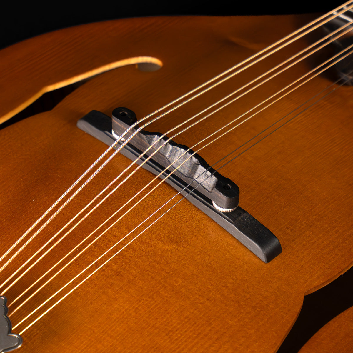 1 3/8" nut width, compound radius ebony fingerboard, nickel plated engraved Gilchrist/Northfield tailpiece. The finish is a satin spirit varnish. Includes soft case.
