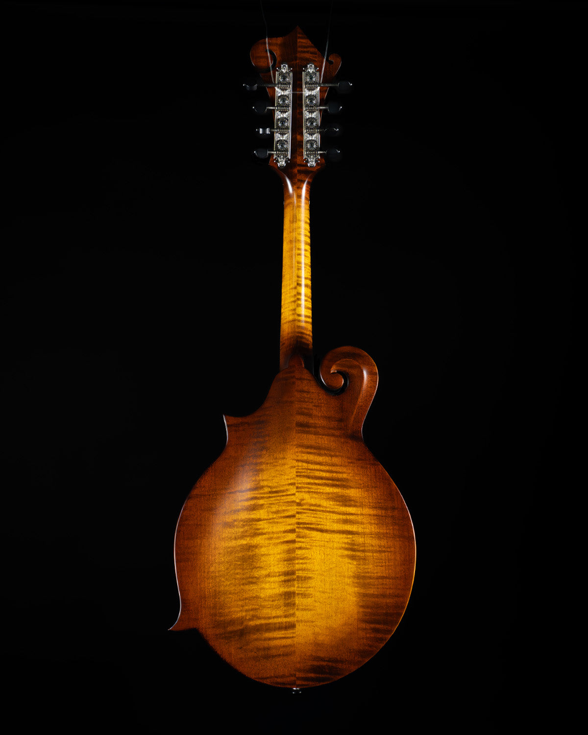 Adirondack spruce top with cherry sunburst. The figured maple is fine, fine, fine. It has a cast tailpiece, bound top, and a bound fingerboard and peghead with visually popping' purfling. The bridge and fingerboard are ebony, as is the bound fingerboard. Gotoh tuners with ebony buttons.