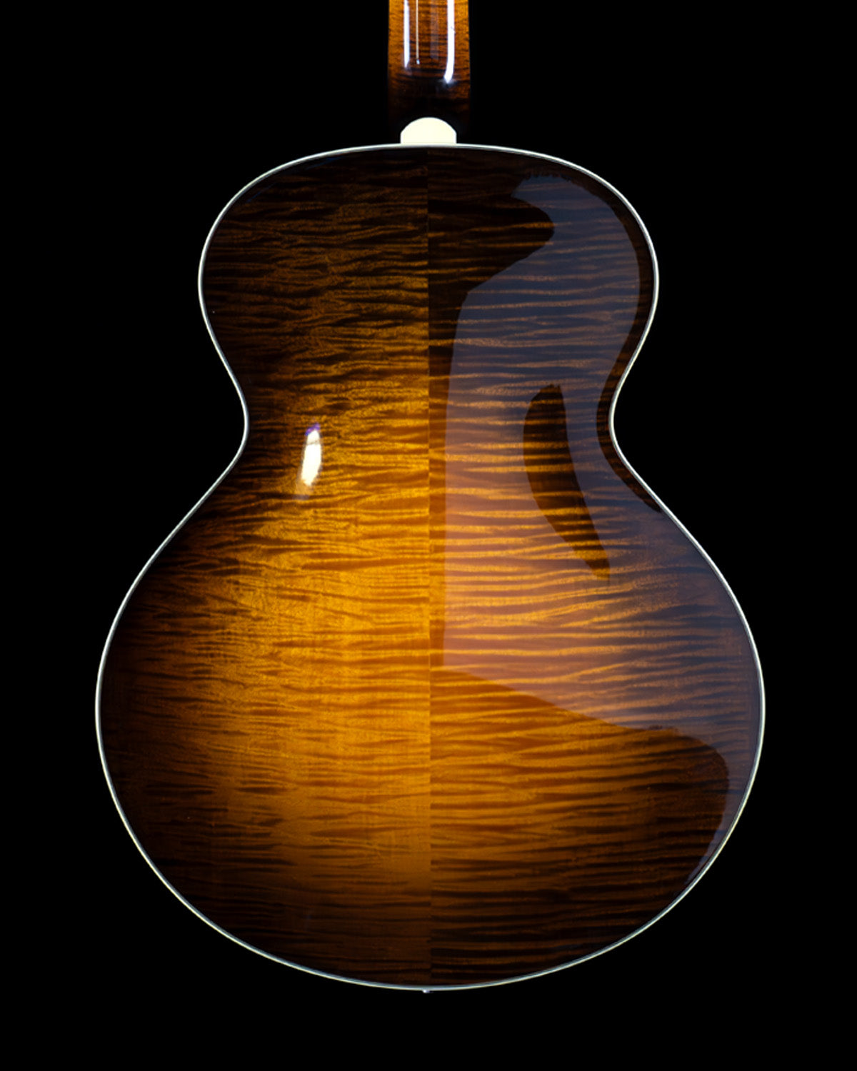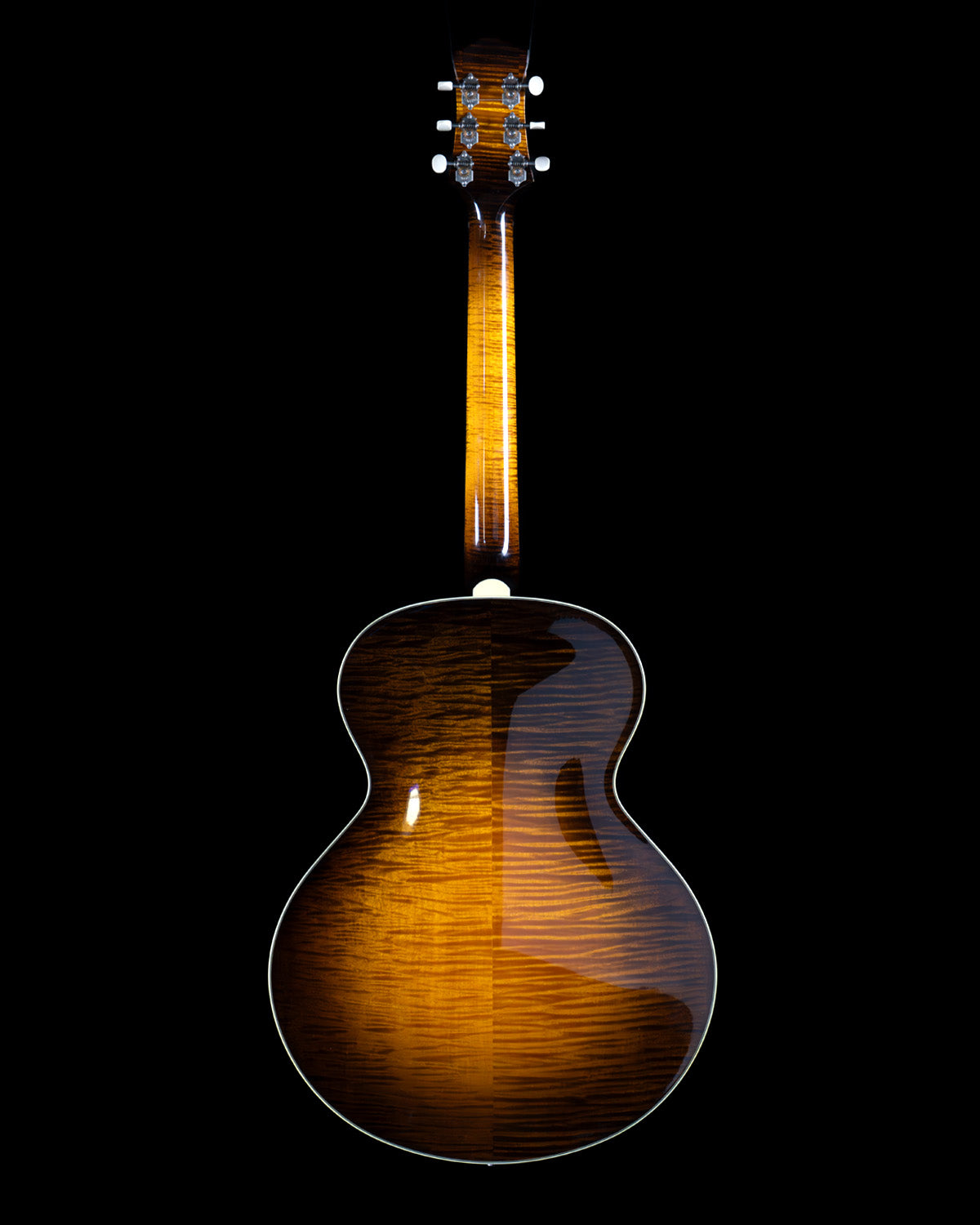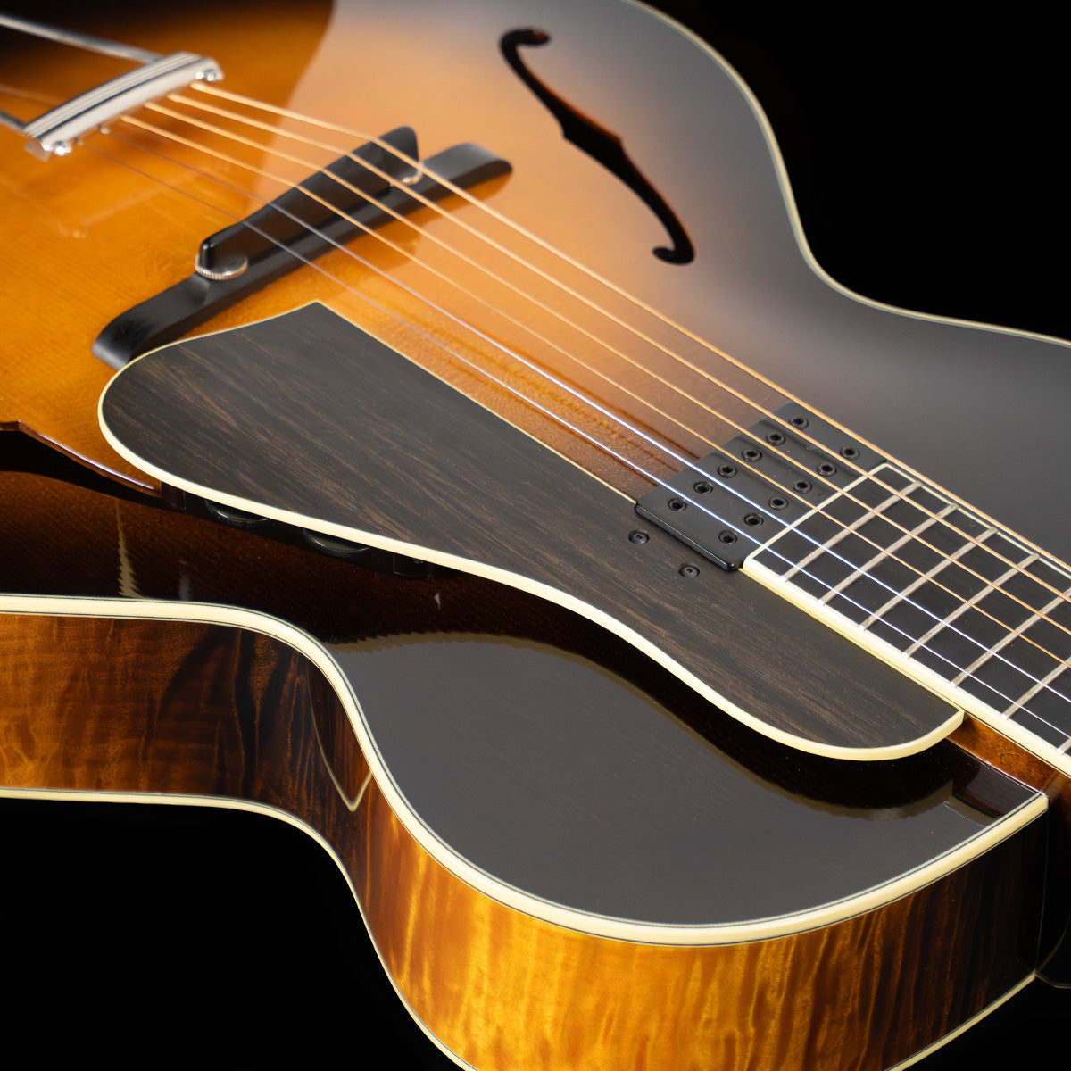 The AT-16 has a solid European spruce top, flamed maple back, sides and neck.  It has a gorgeous full-body sunburst and is fully bound in ivoroid, including the ebony pick guard.  It has a compensated ebony bridge, ebony fingerboard with compound radius and dot inlays, and Waverly tuners with ivoroid buttons.  It has a long 25 1/2" scale neck with 1 11/16" nut width and 2 3/16" string spacing at the saddle.  The neck is a C profile and measures .885" at the first fret and .978" at the ninth.  This guitar weighs in at just 5 lbs, 1 oz.