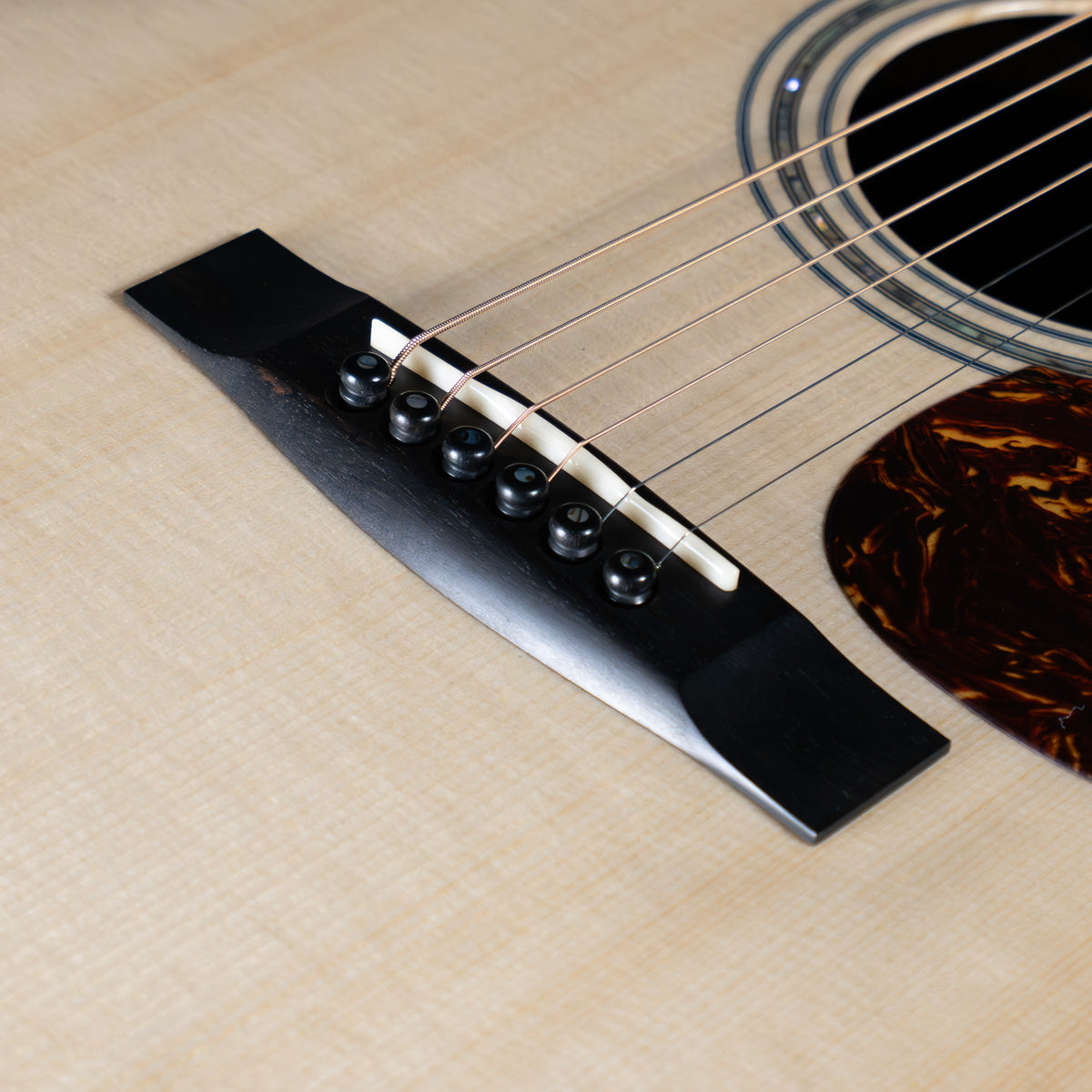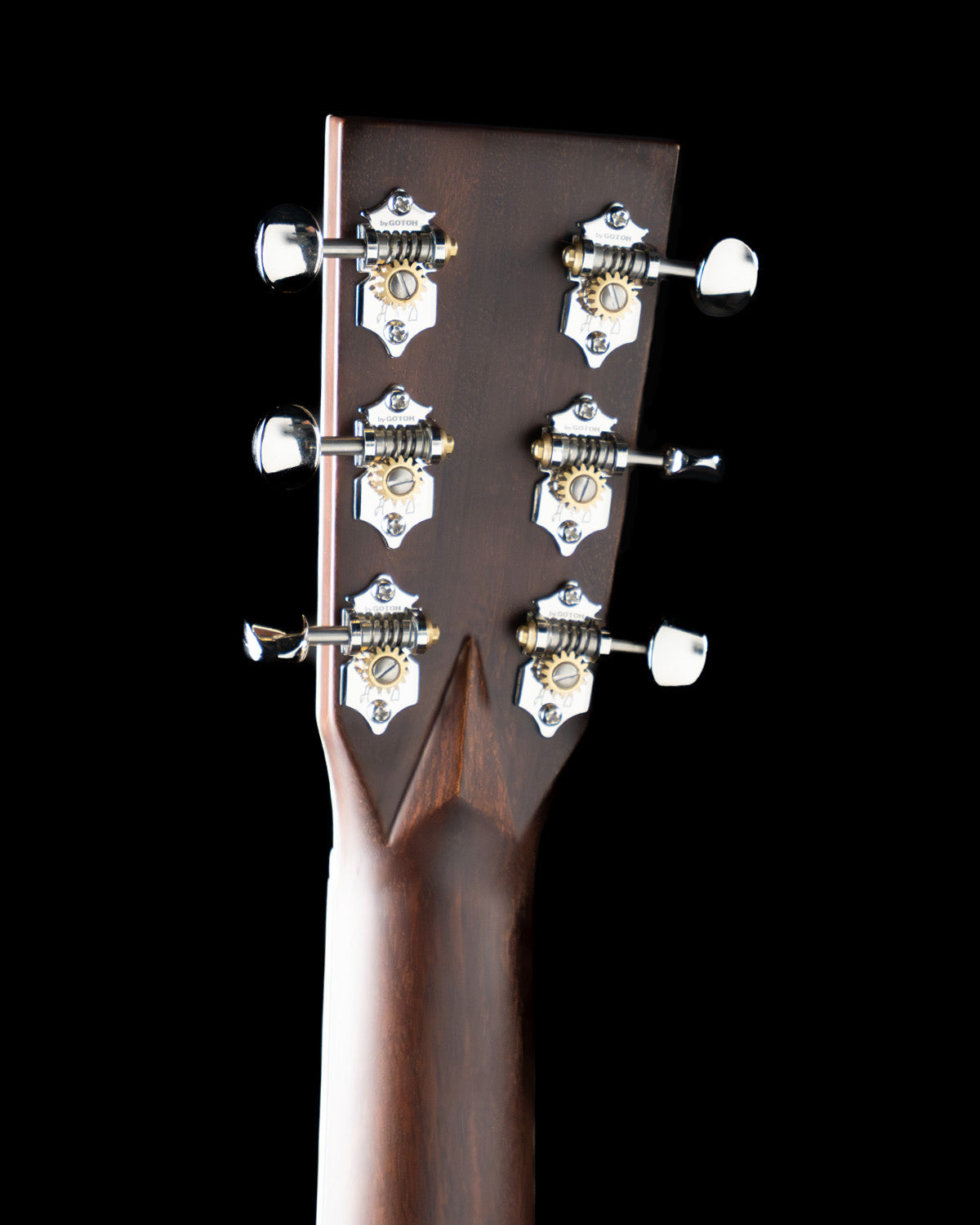 The mahogany neck has a smooth satin finish and a modified V profile with 1 3/4" nut and string spacing at the saddle that measures just a hair under 2 1/4". The neck thickness measures .875" at the first fret and .96" at the ninth. The fingerboard is ebony with small diamond inlays.