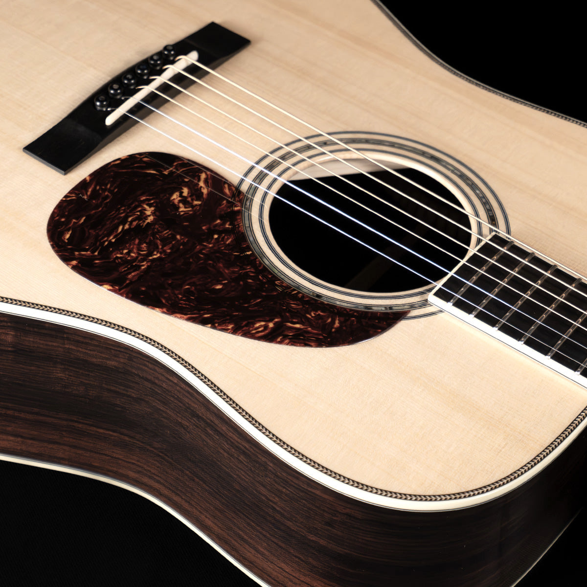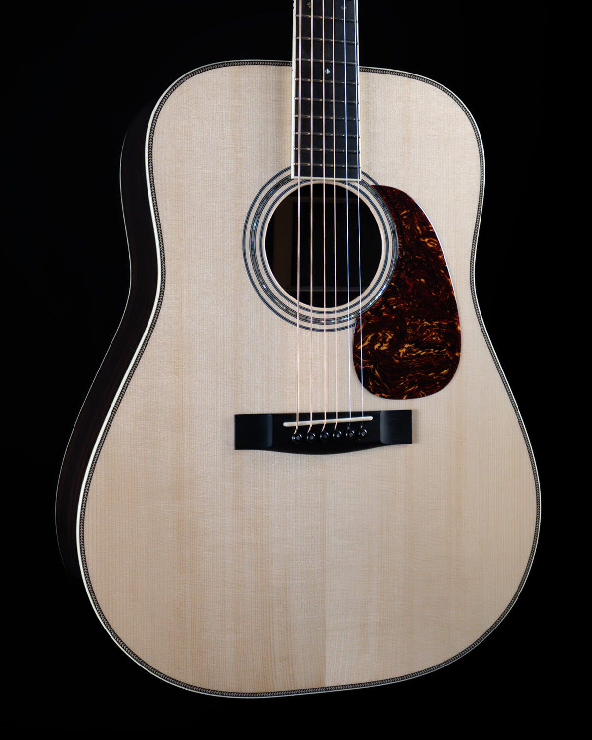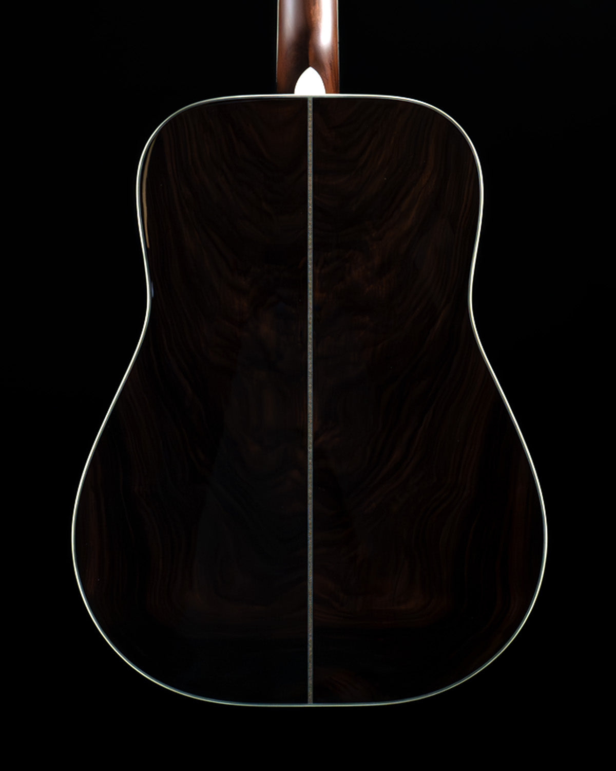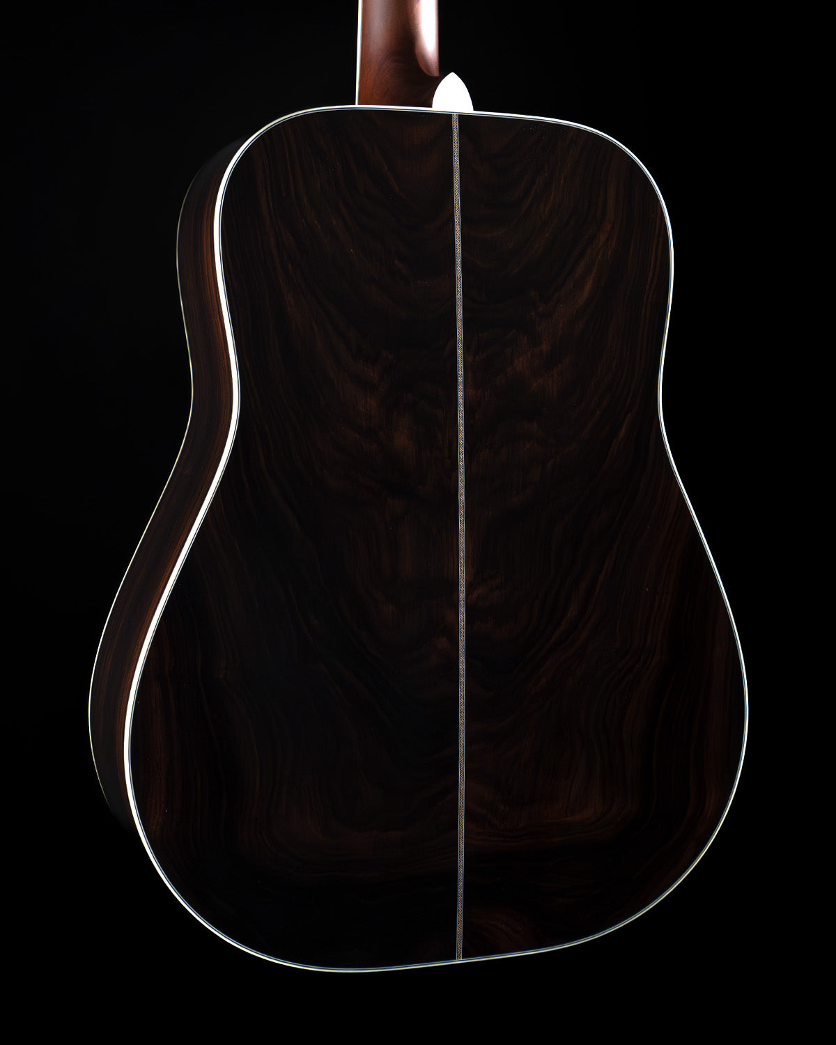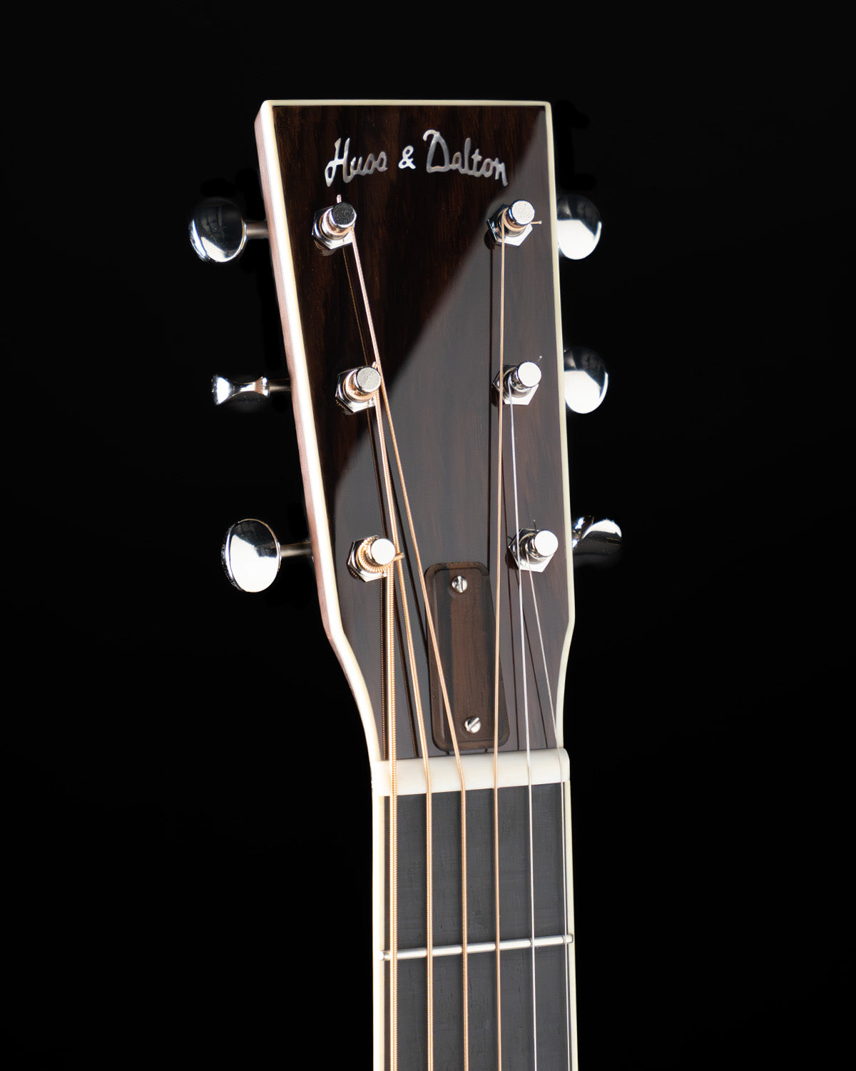 (NEW) Look at this pretty young thing! This dreadnought was built for us by Huss & Dalton with some nice, stiff Italian spruce and some awesome looking figured Indian rosewood. This is one classy guitar! We wanted to dress it up just a little bit, so in addition to the traditional herringbone top border we asked for an abalone rosette and for full binding on the body, neck and peghead.