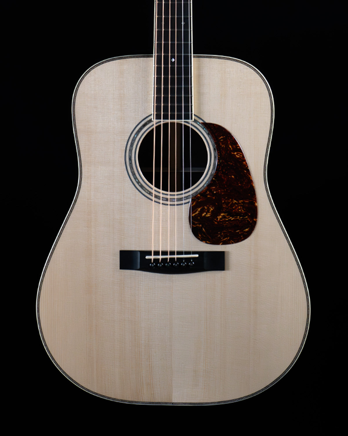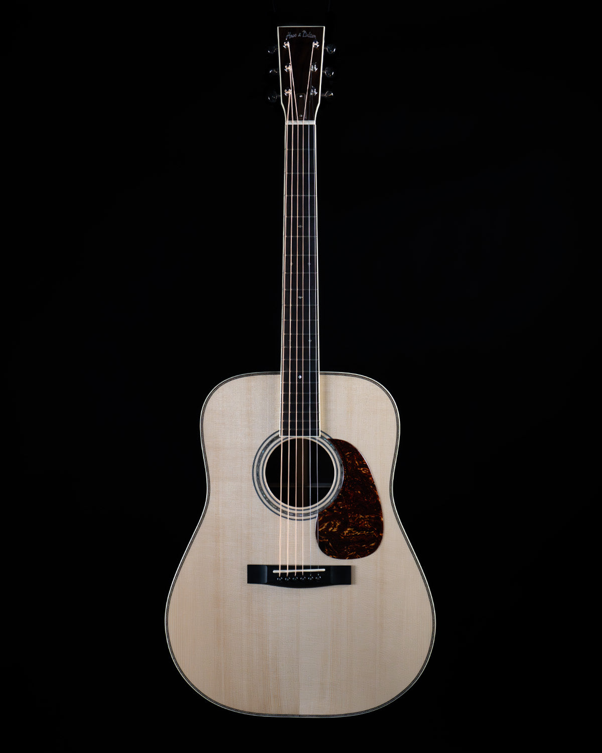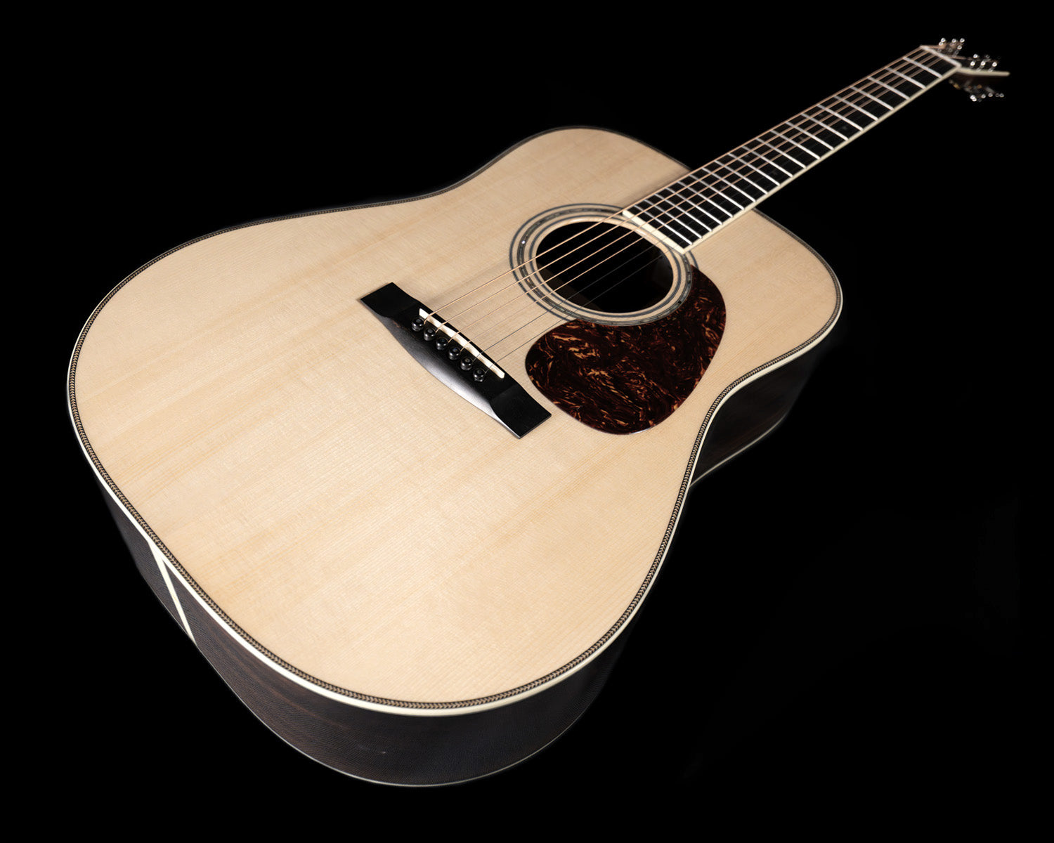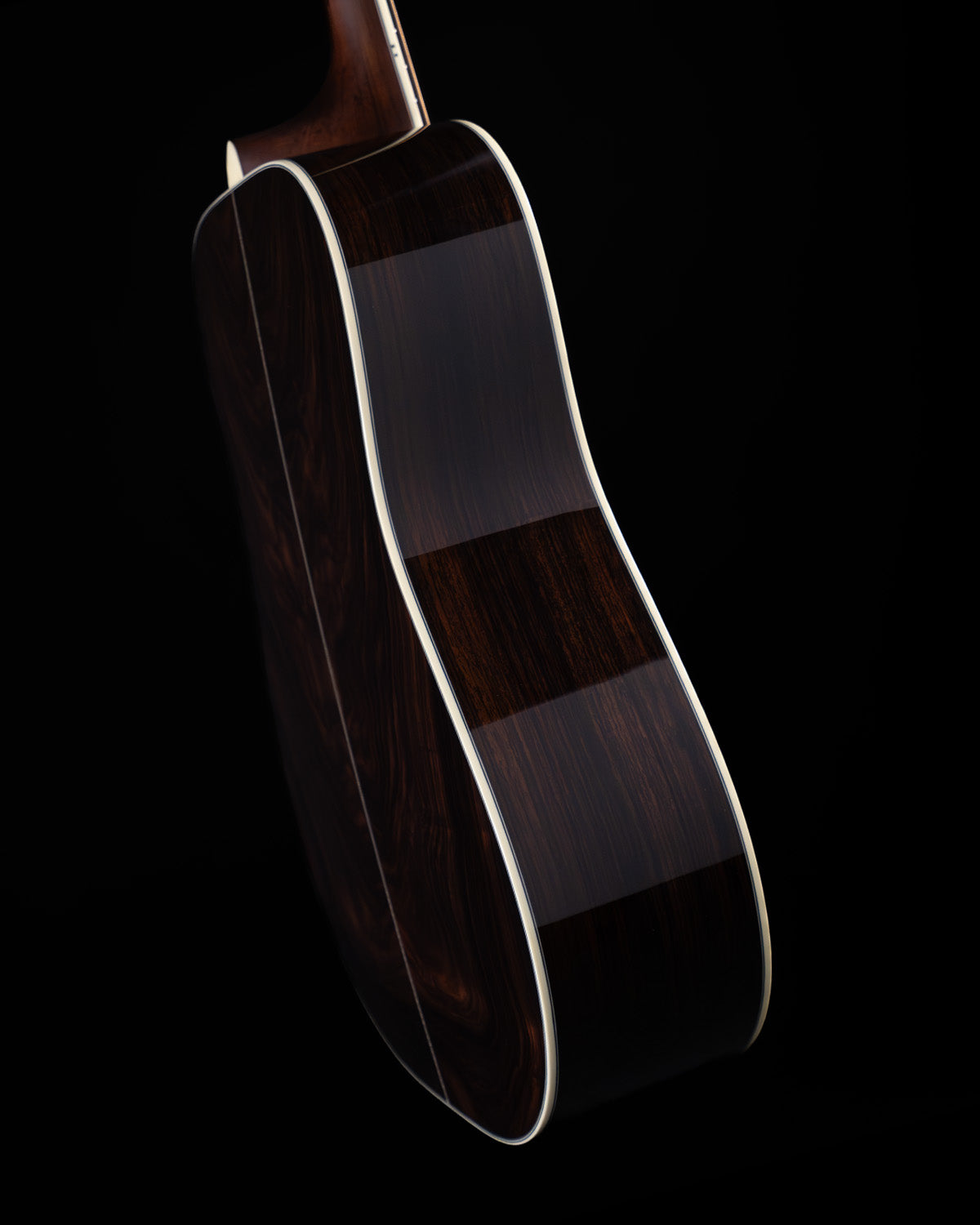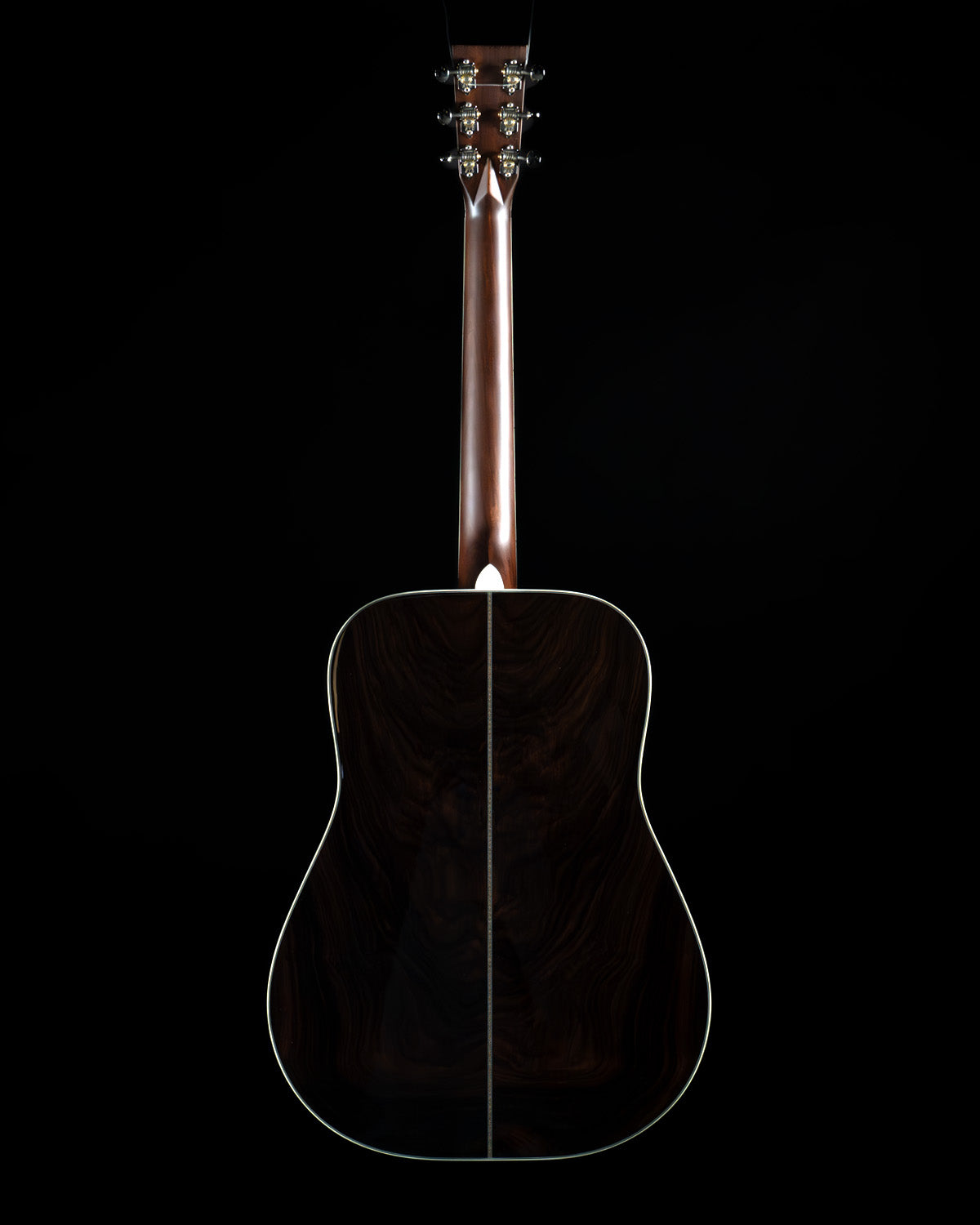 (NEW) Look at this pretty young thing! This dreadnought was built for us by Huss & Dalton with some nice, stiff Italian spruce and some awesome looking figured Indian rosewood. This is one classy guitar! We wanted to dress it up just a little bit, so in addition to the traditional herringbone top border we asked for an abalone rosette and for full binding on the body, neck and peghead.