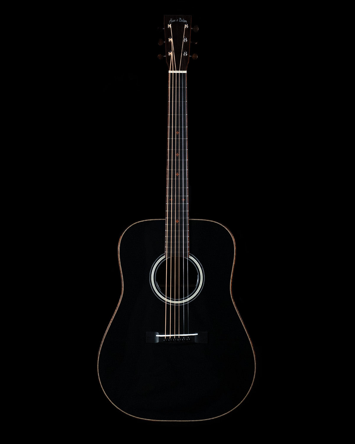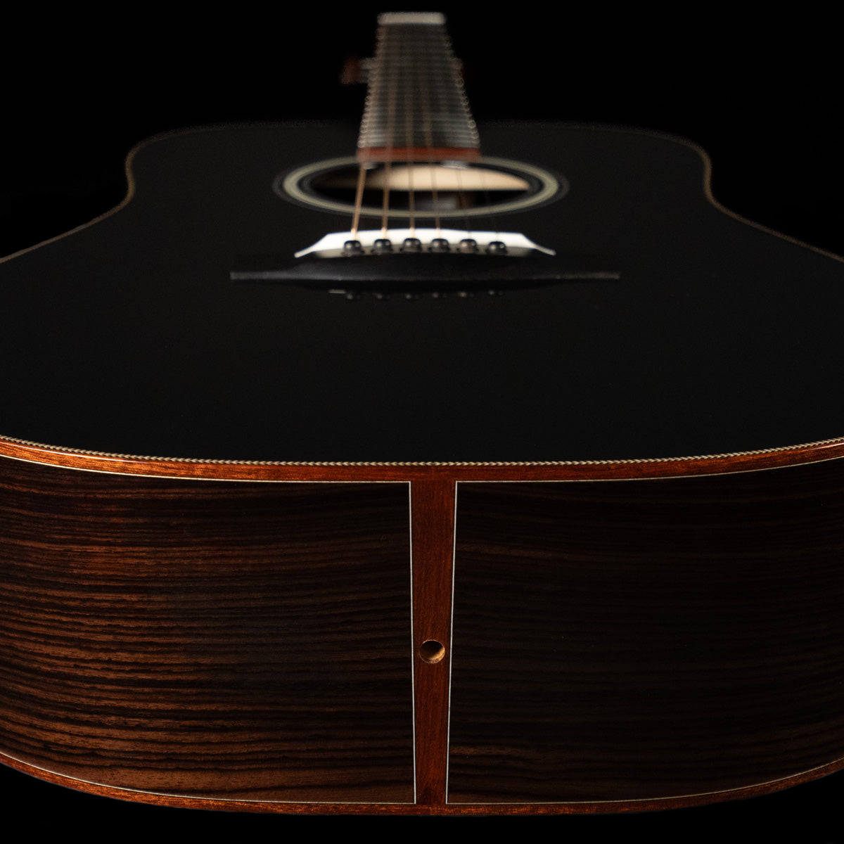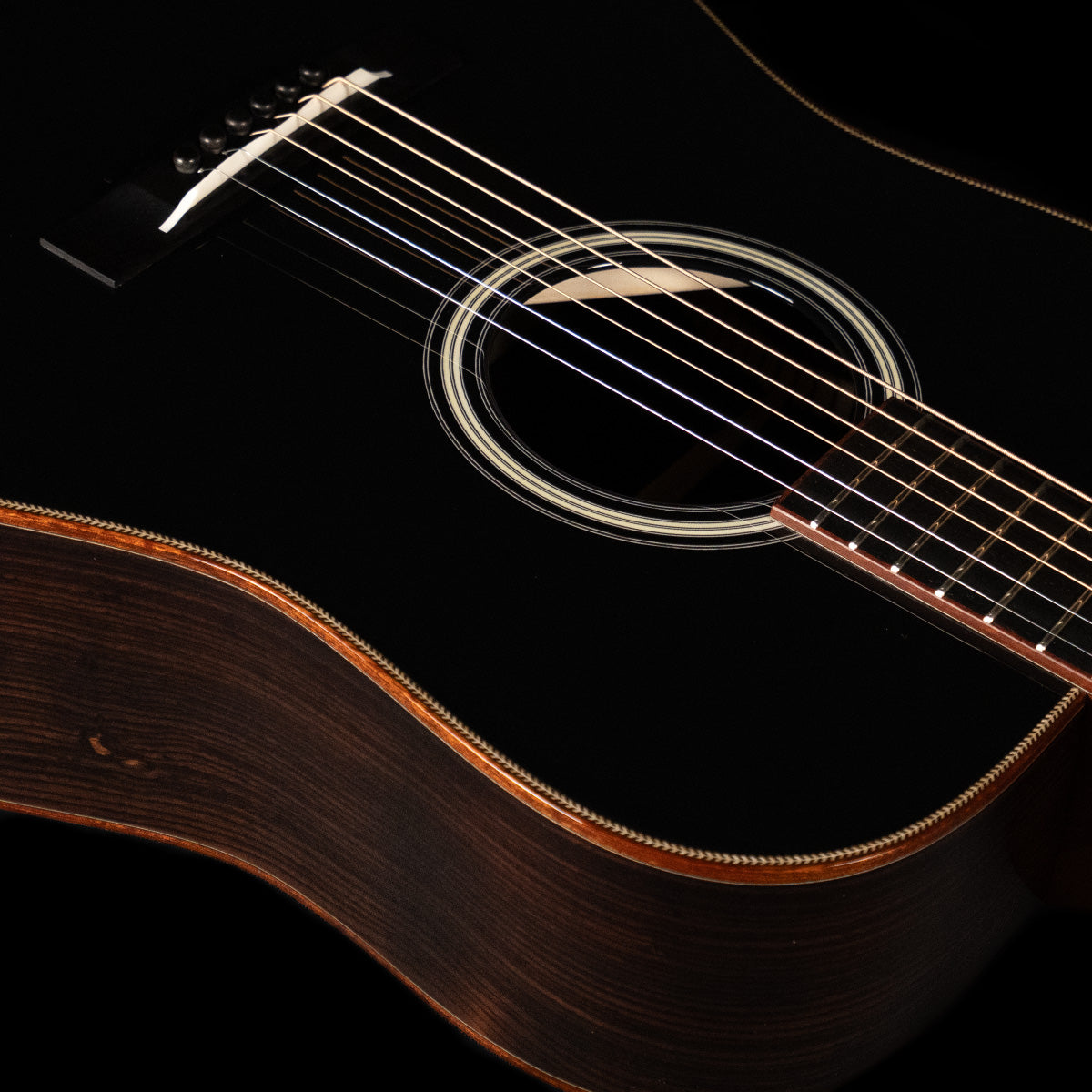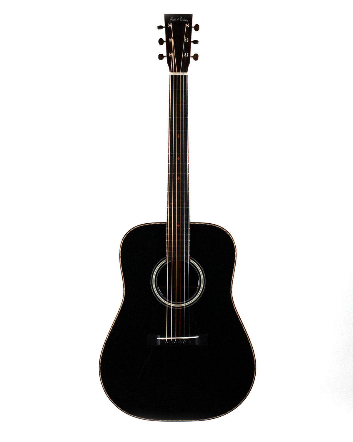 We paired a thermo-cured (torrefied) Sitka spruce top with a wild looking set of Indian rosewood, and this combo adds up to a powerful yet complex sounding instrument. What really sets it off visually are the bloodwood accents (bound body, fingerboard, peghead against the glossy black top finish. We asked Brian at H&D to give us custom cross inlays in bloodwood on the fingerboard, and we couldn't be happier with the way everything came together.