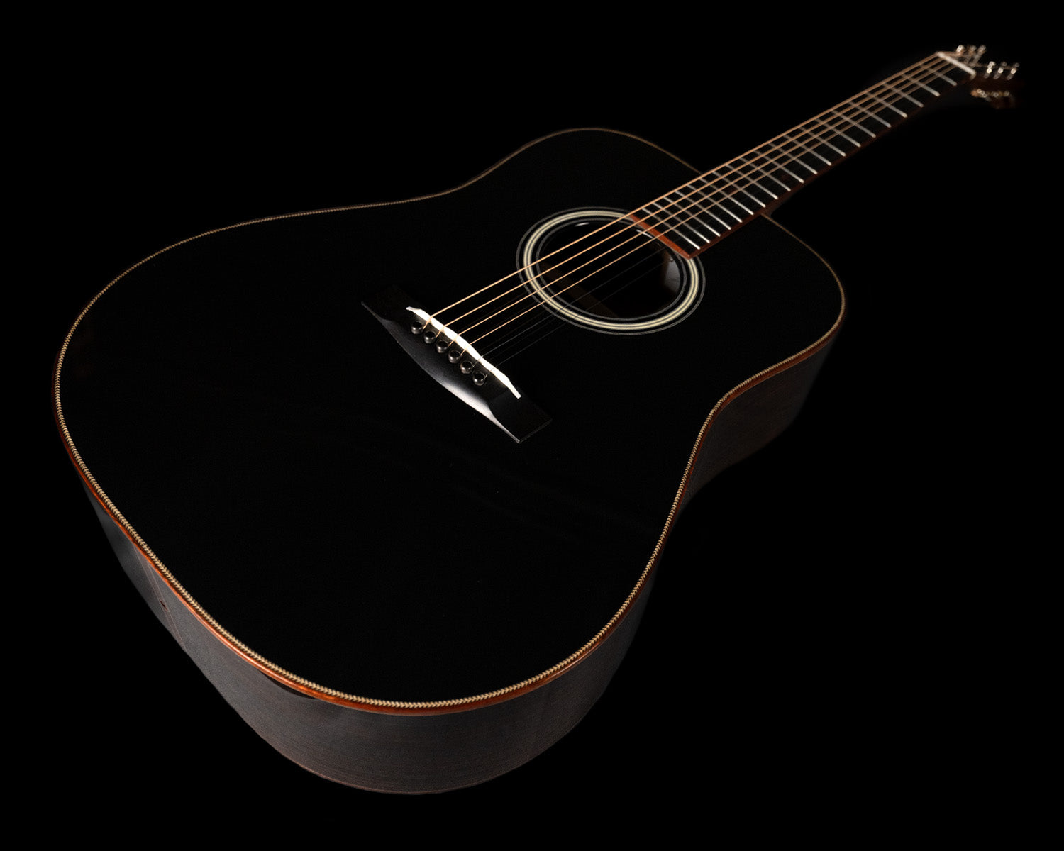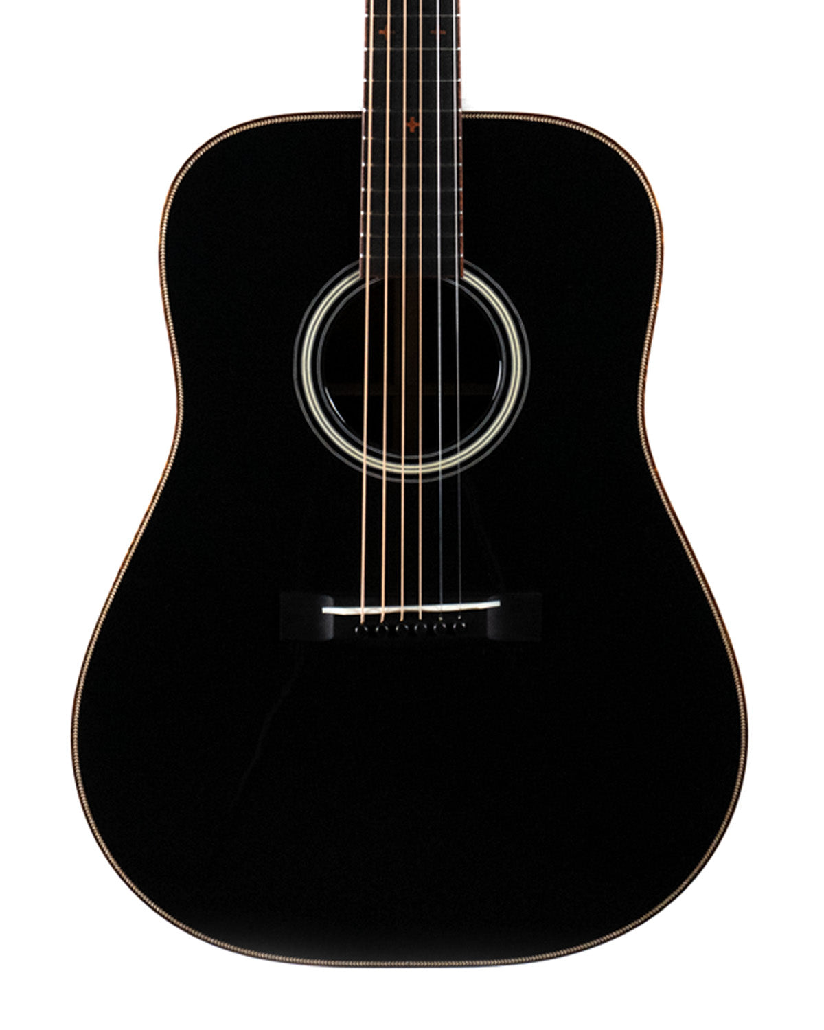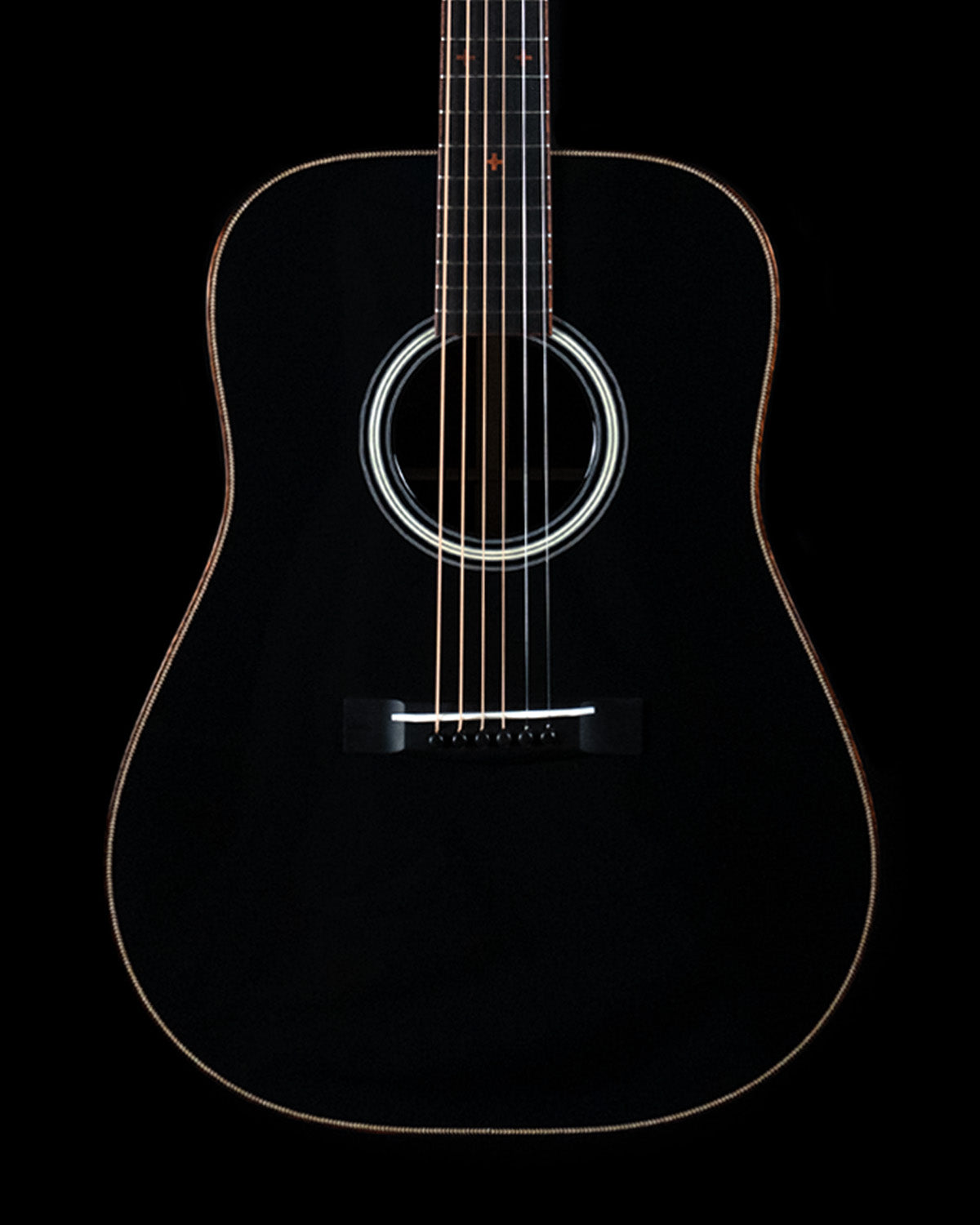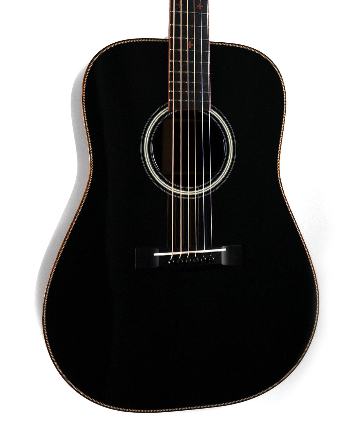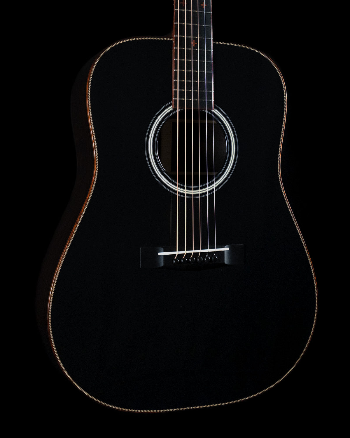 We paired a thermo-cured (torrefied) Sitka spruce top with a wild looking set of Indian rosewood, and this combo adds up to a powerful yet complex sounding instrument. What really sets it off visually are the bloodwood accents (bound body, fingerboard, peghead against the glossy black top finish. We asked Brian at H&D to give us custom cross inlays in bloodwood on the fingerboard, and we couldn't be happier with the way everything came together.