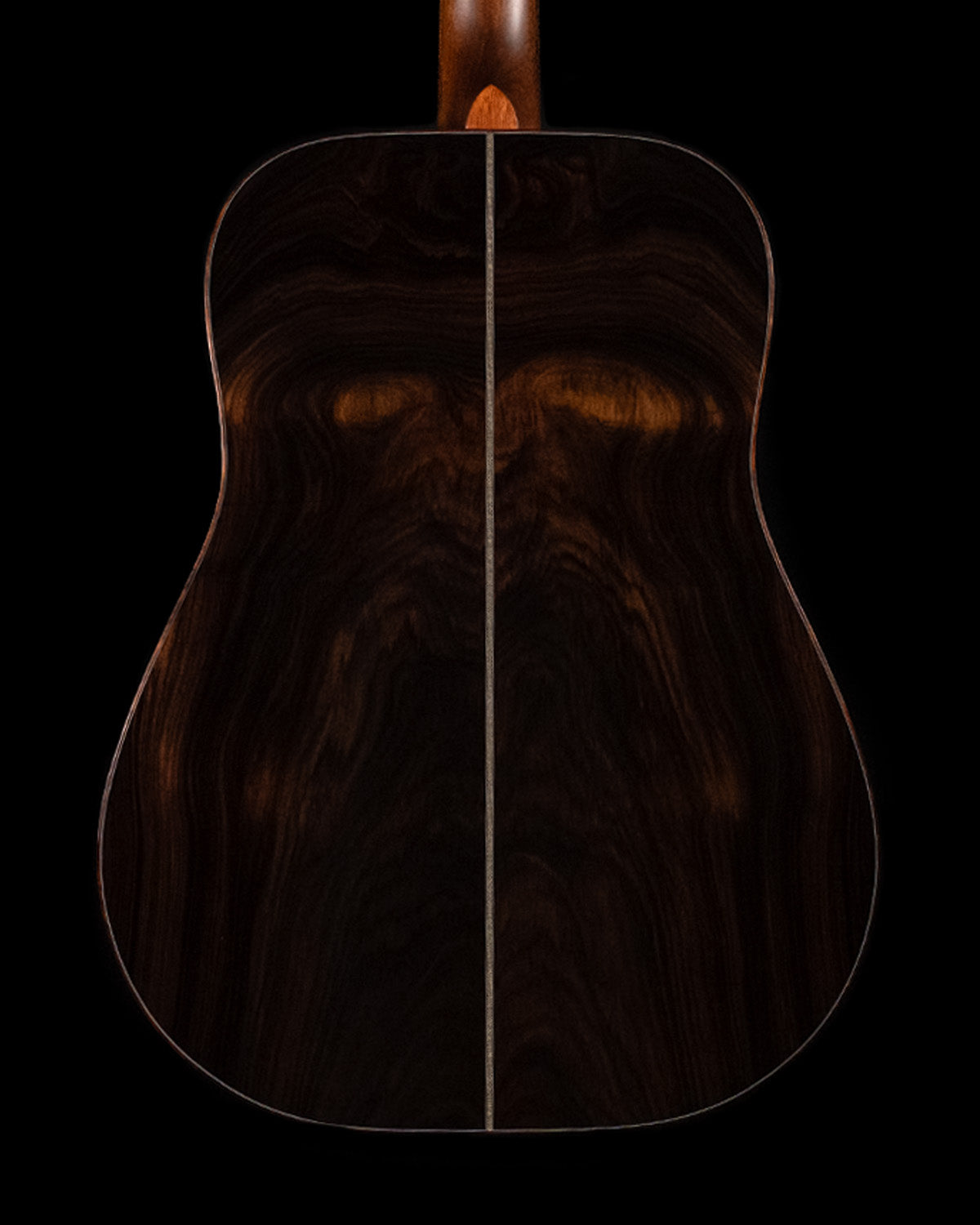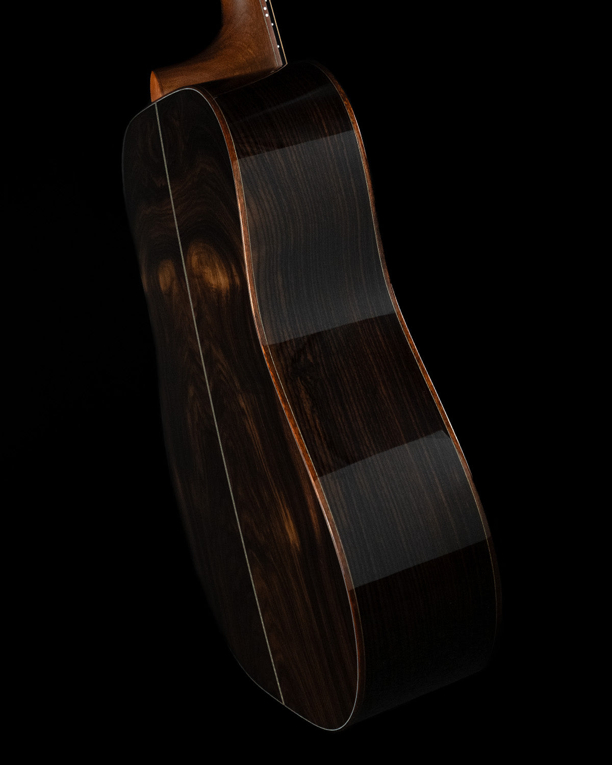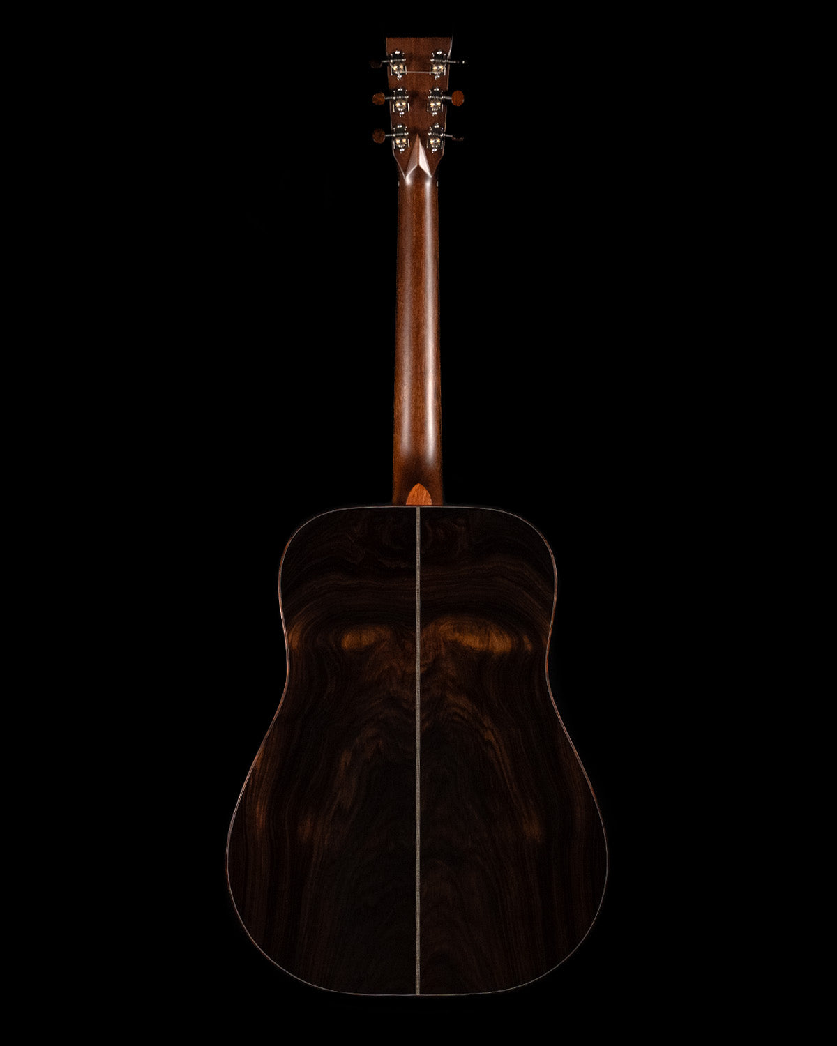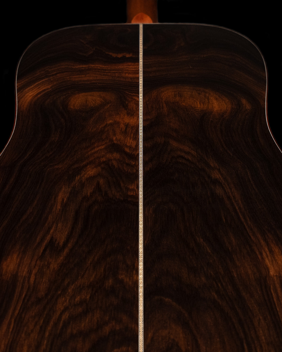 We paired a thermo-cured (torrefied) Sitka spruce top with a wild looking set of Indian rosewood, and this combo adds up to a powerful yet complex sounding instrument. What really sets it off visually are the bloodwood accents (bound body, fingerboard, peghead against the glossy black top finish. We asked Brian at H&D to give us custom cross inlays in bloodwood on the fingerboard, and we couldn't be happier with the way everything came together.