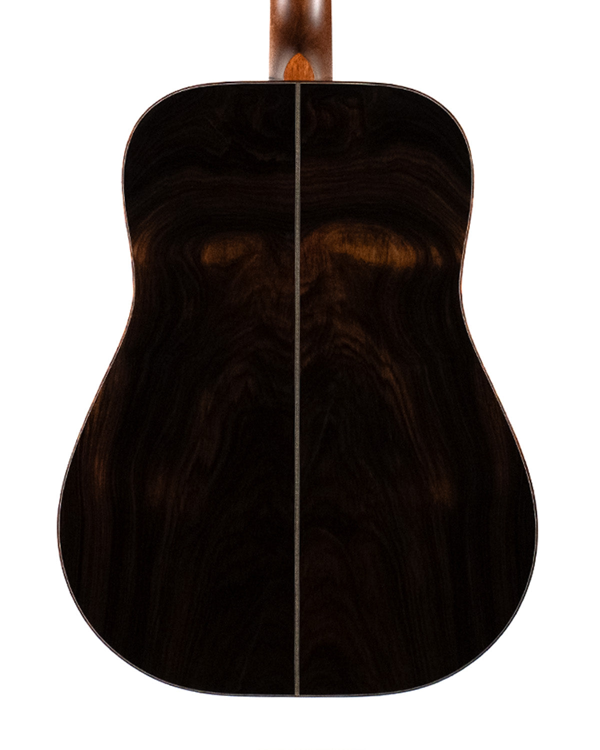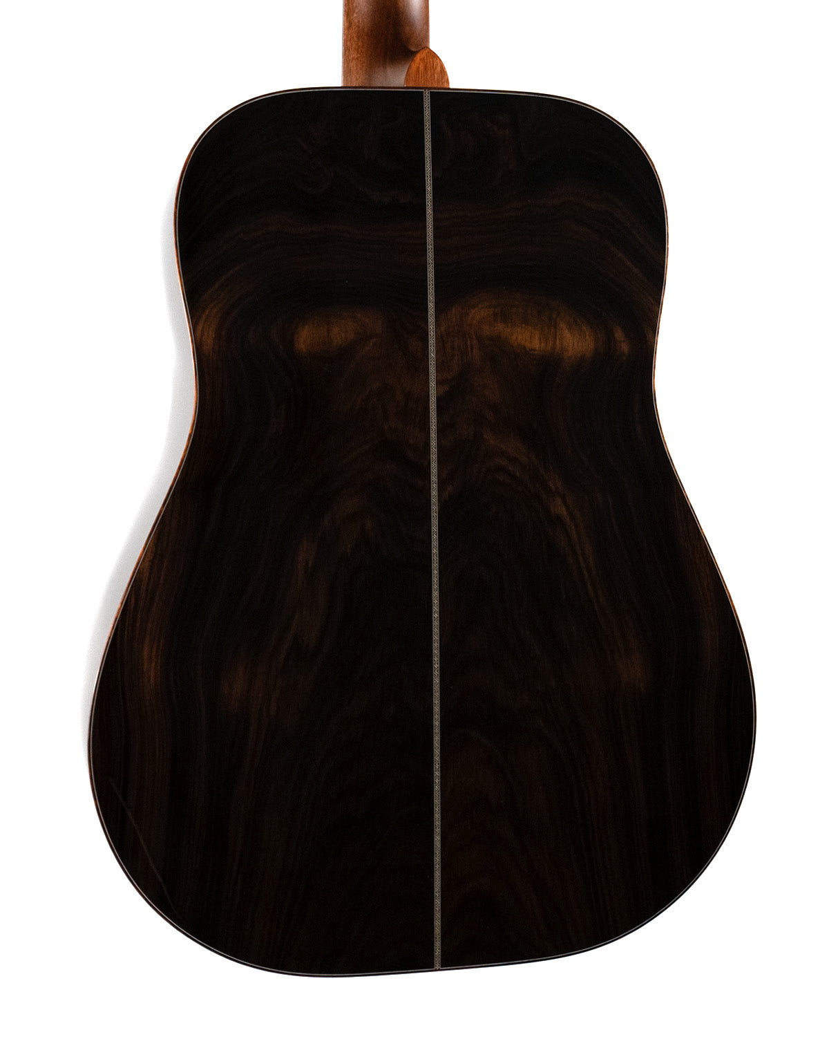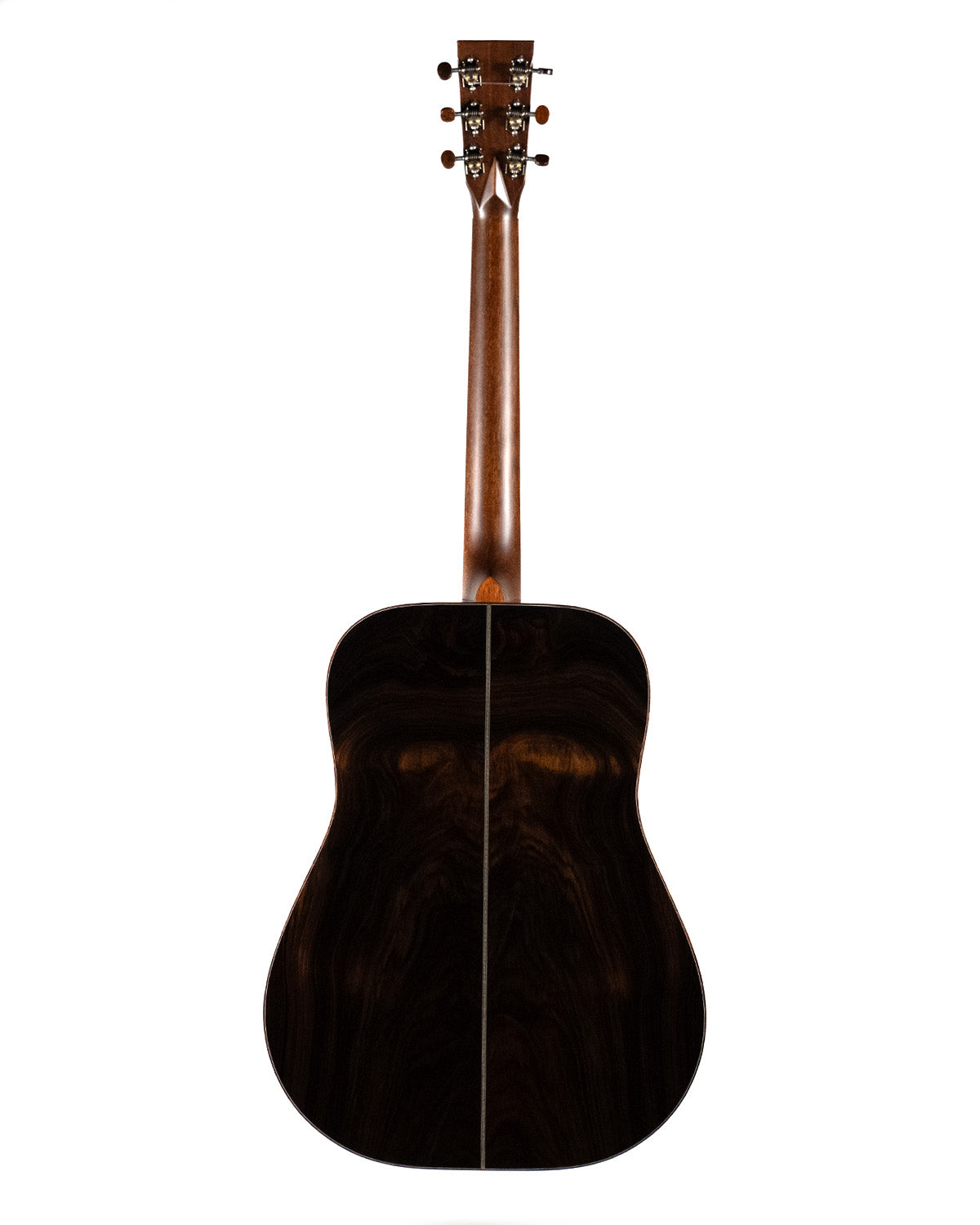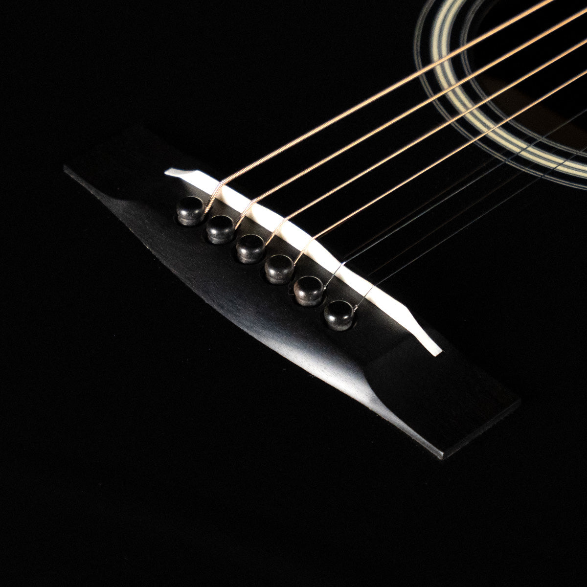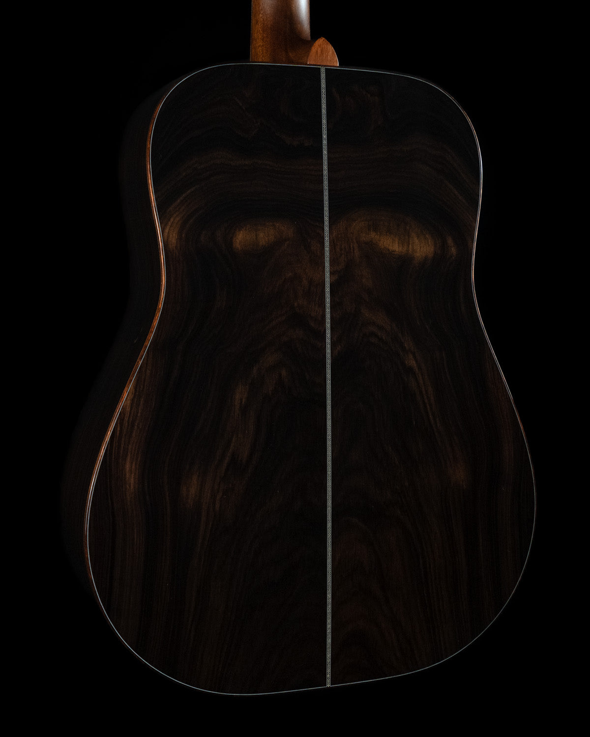 We paired a thermo-cured (torrefied) Sitka spruce top with a wild looking set of Indian rosewood, and this combo adds up to a powerful yet complex sounding instrument. What really sets it off visually are the bloodwood accents (bound body, fingerboard, peghead against the glossy black top finish. We asked Brian at H&D to give us custom cross inlays in bloodwood on the fingerboard, and we couldn't be happier with the way everything came together.