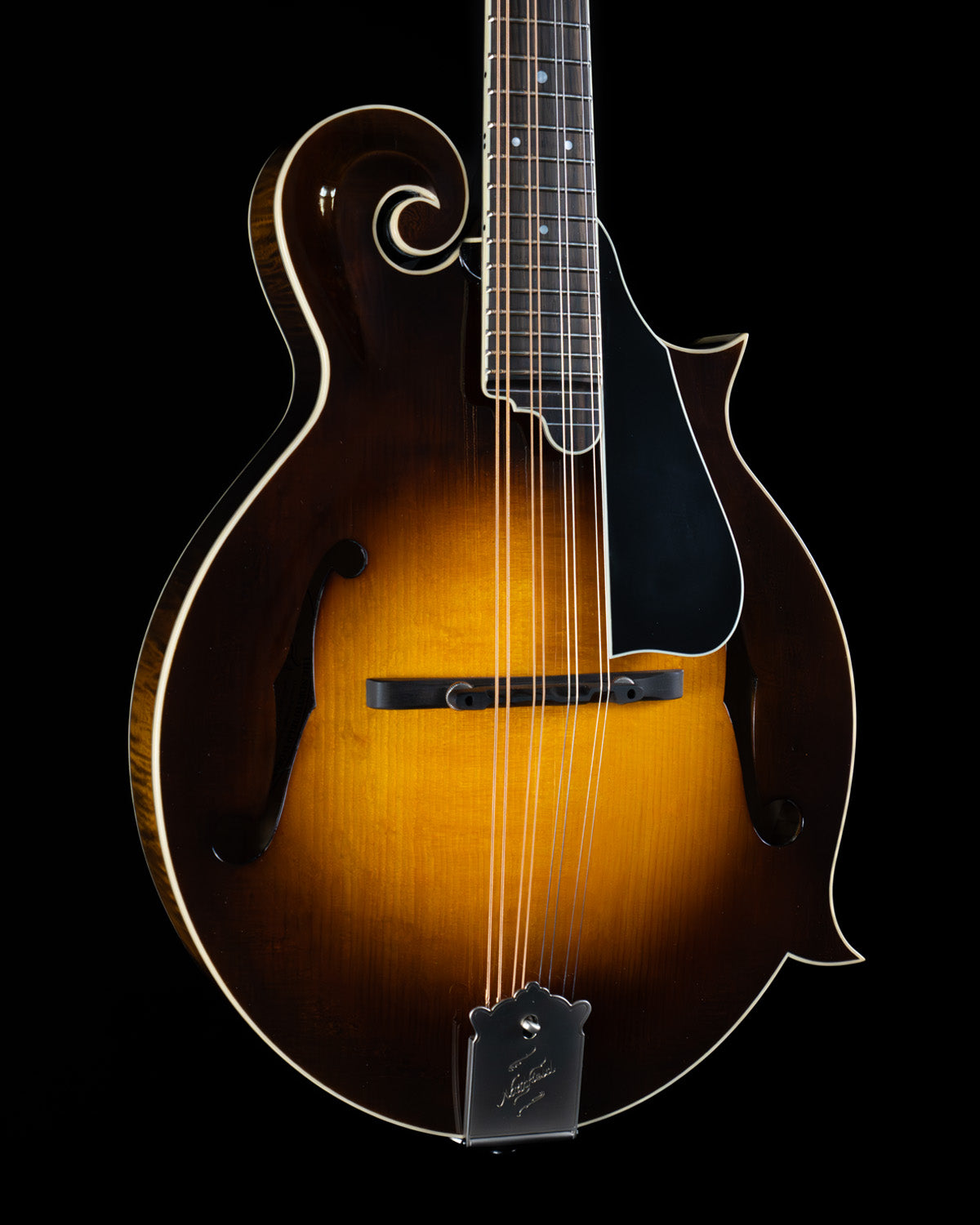 The top on this one is special Adirondack with striking wide grain, and the back, sides, and neck are highly figured maple.  The high gloss finish on this one makes both the colors and the figure really pop!  The fingerboard and bridge are ebony.  For hardware, there are Gotoh tuners and a nickel-plated engraved Gilchrist/Northfield tailpiece.  The pick guard is bound ebony.  Wider 1 3/16" nut width.  Hybrid varnish finish with vintage sunburst.  Includes the Airloom "Recurve" case.